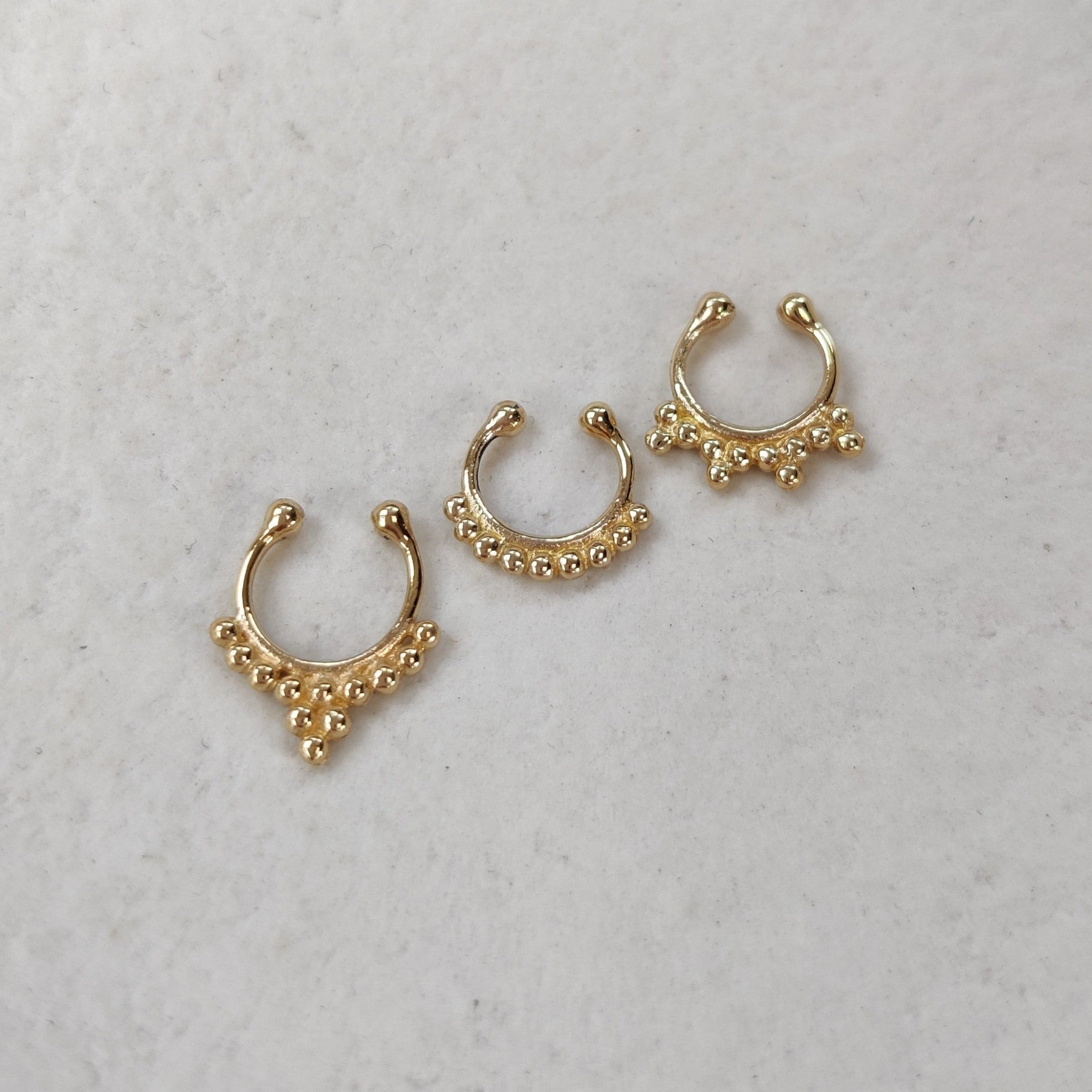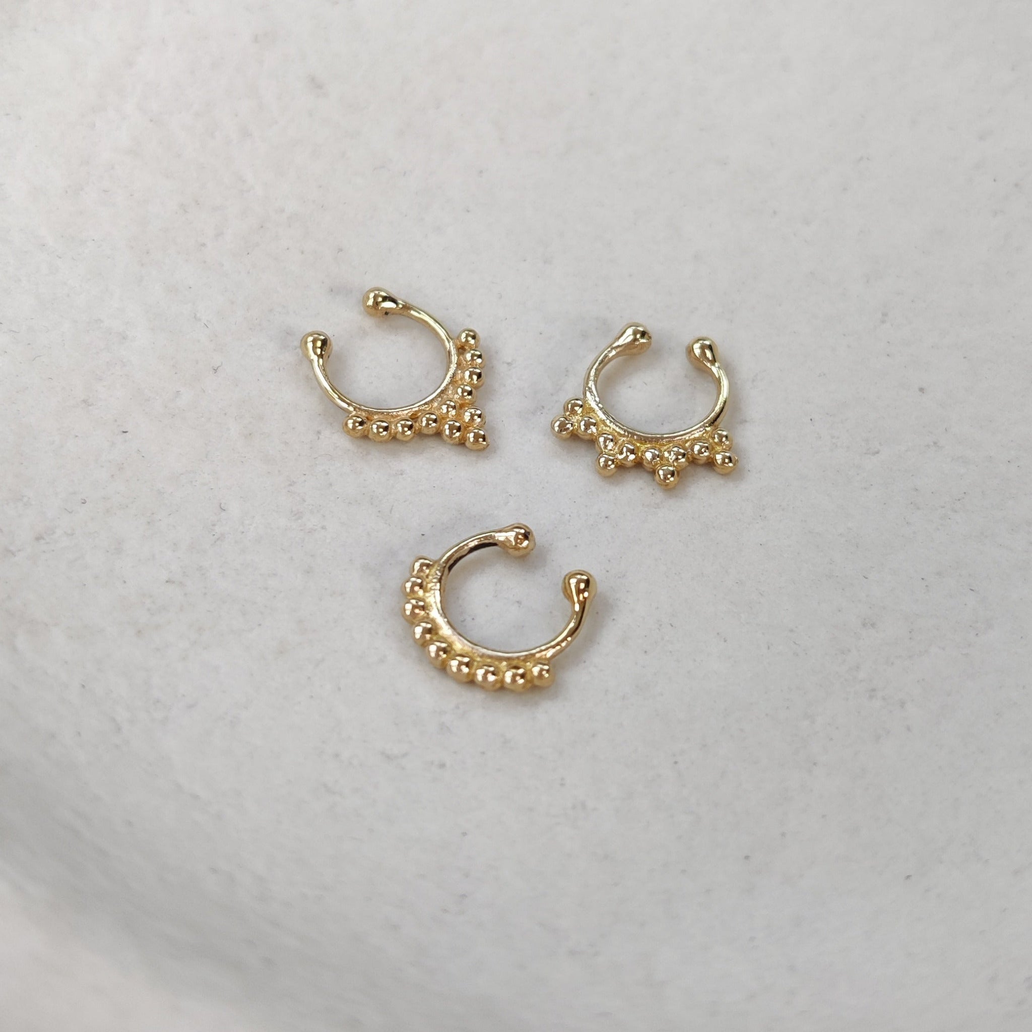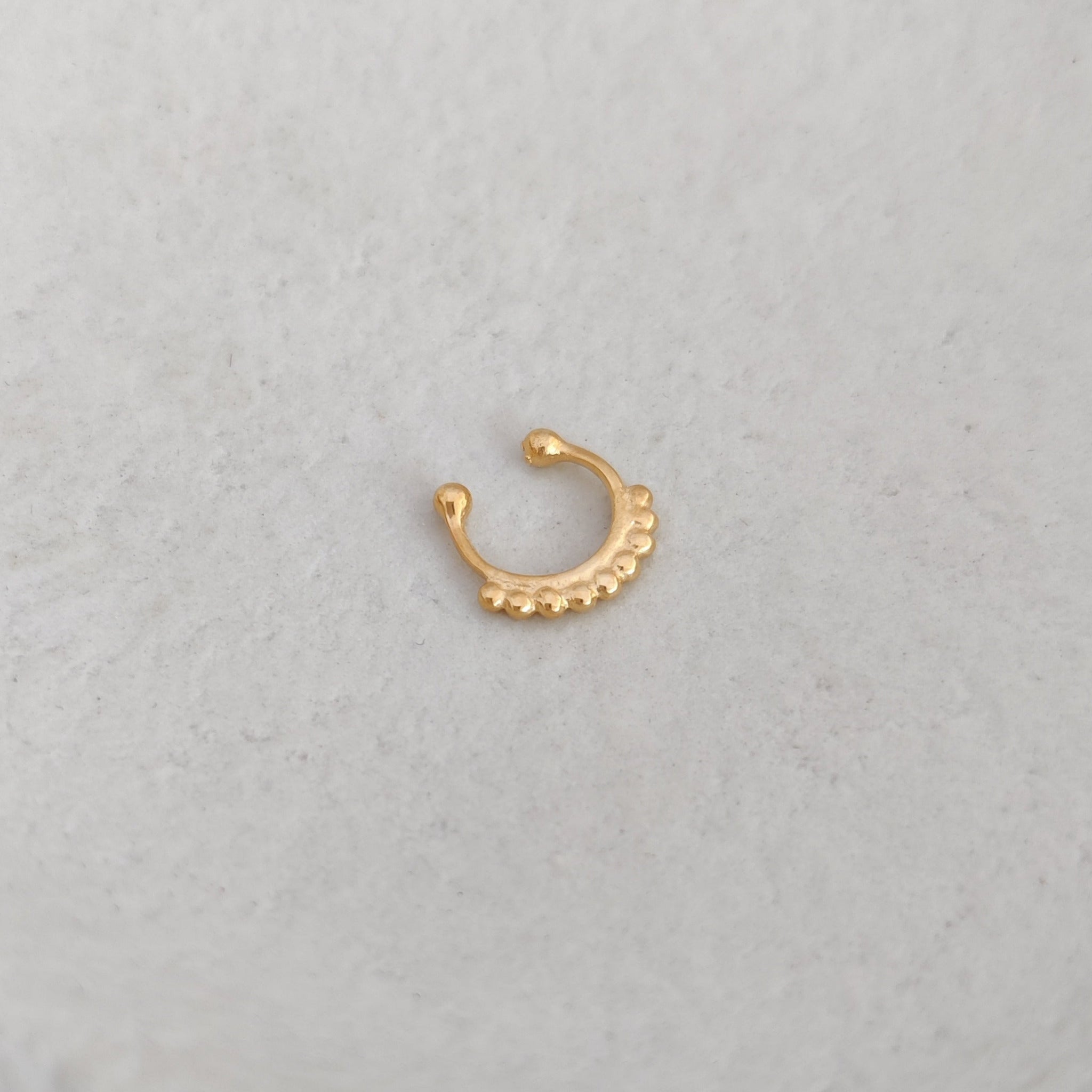 Adorn yourself with the Tiny Fake Septum Ring in 18k gold vermeil - no piercing required for this beautiful nose ring. Designed to fit snugly and comfortably against your nose, this feminine and delicate piece adds the perfect little detail to your look. Ideal for daily wear, festivals, or special occasions. Featuring a minimalist design with perfectly placed small round beads and three unique designs to choose from.