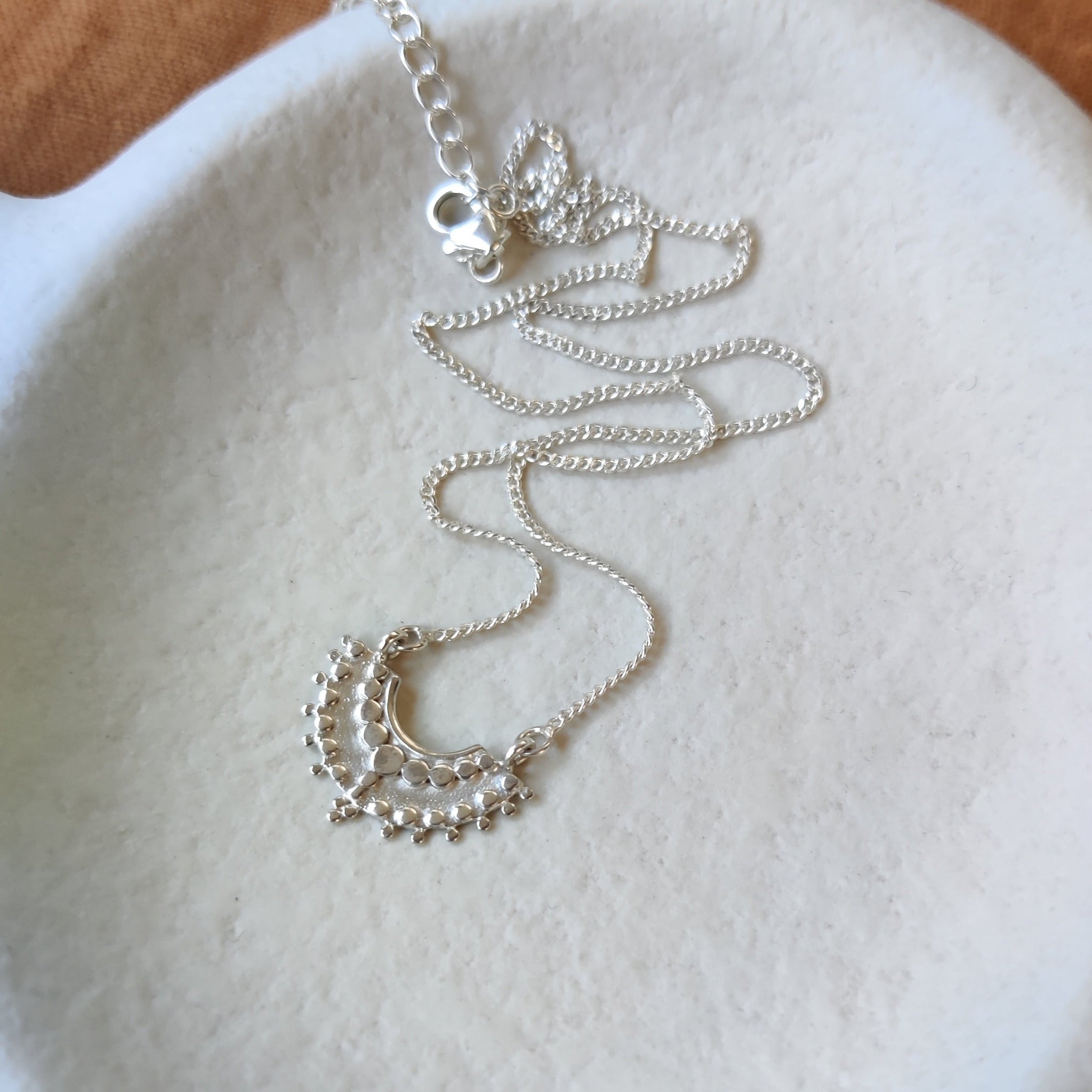 The dainty Ancient Choker has a beautiful half-moon shaped pendant with intricate dotted details.