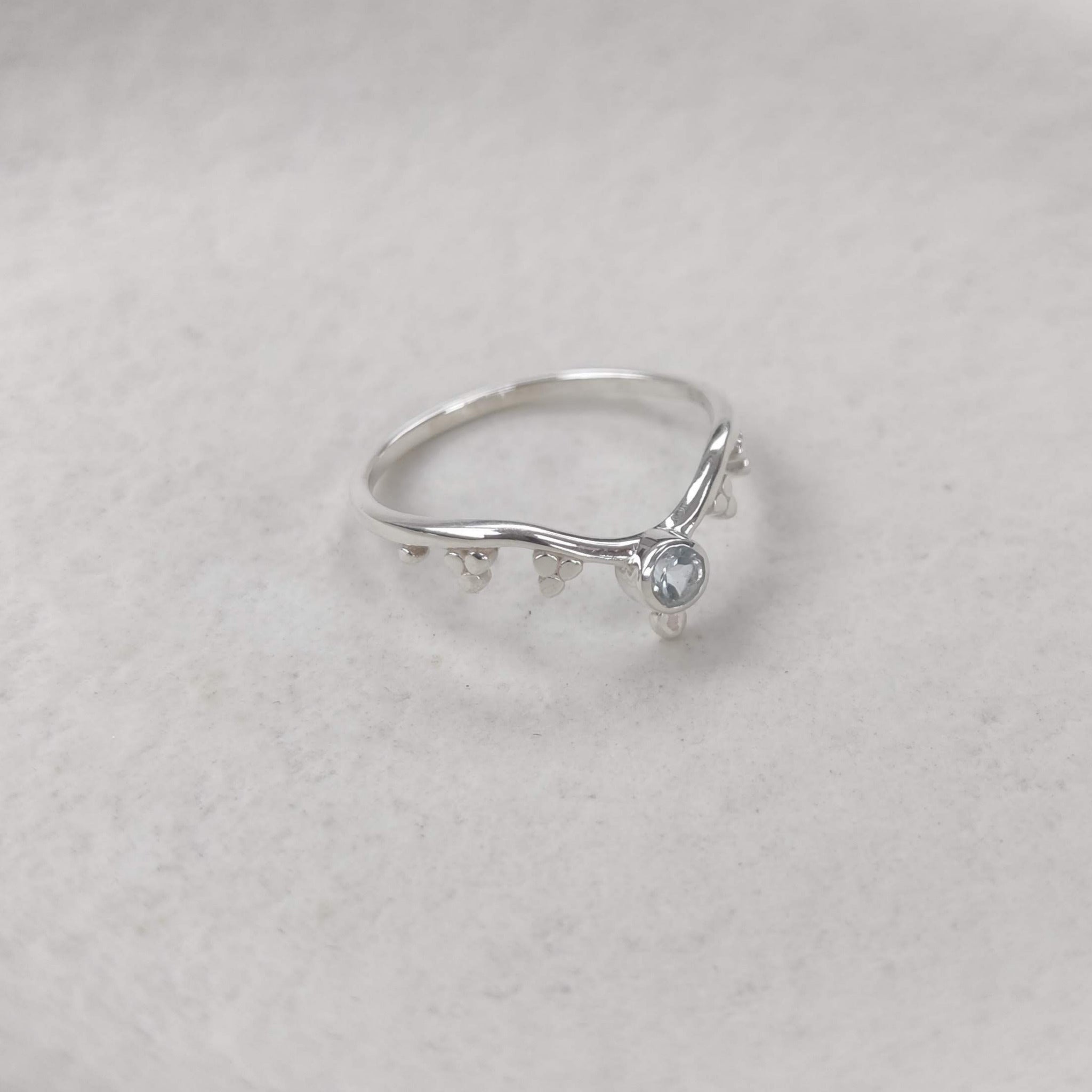 The Royal Ring features a tiny Blue Topaz on a delicate V-shaped band with dotted accents. A symbol of calm and clarity, it’s ideal for stacking with your favorite gemstone rings.