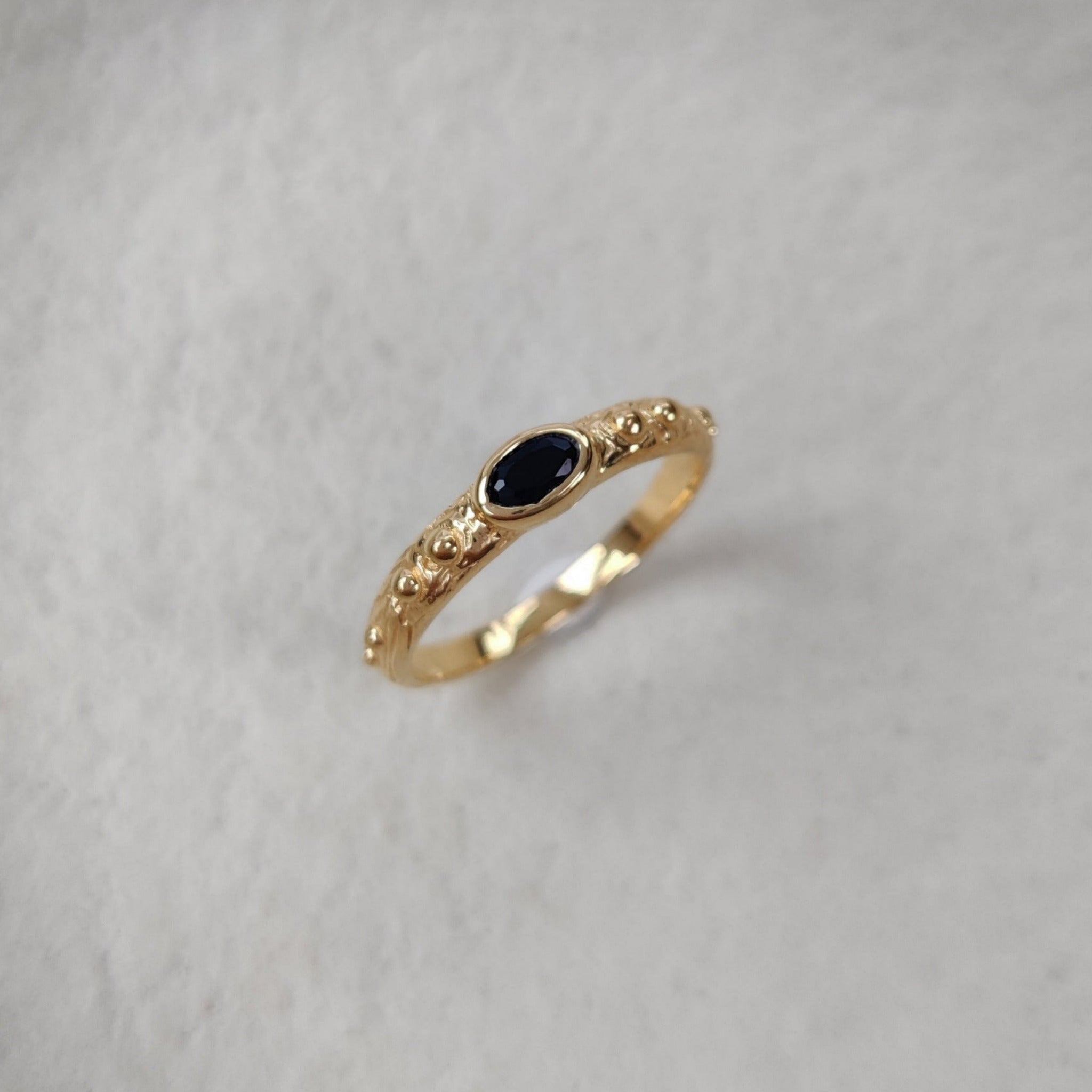 The Fable Ring evokes the mystique of an ancient treasure fused with modern aesthetics, featuring a rustic gold band accented with delicate round beads and a small yet striking black onyx.