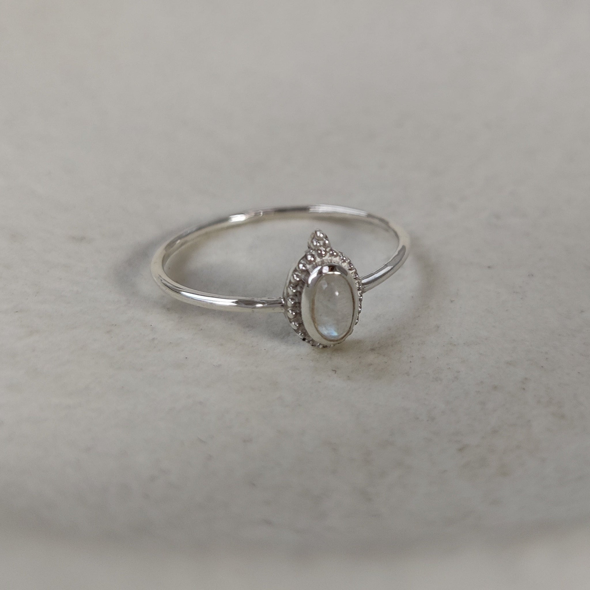 The Classic Ring features a tiny natural moonstoe adorned with dotted details on a slender band. Crafted from sterling silver, this dainty ring offers a timeless and bohemian style, perfect for complementing your daily stack.