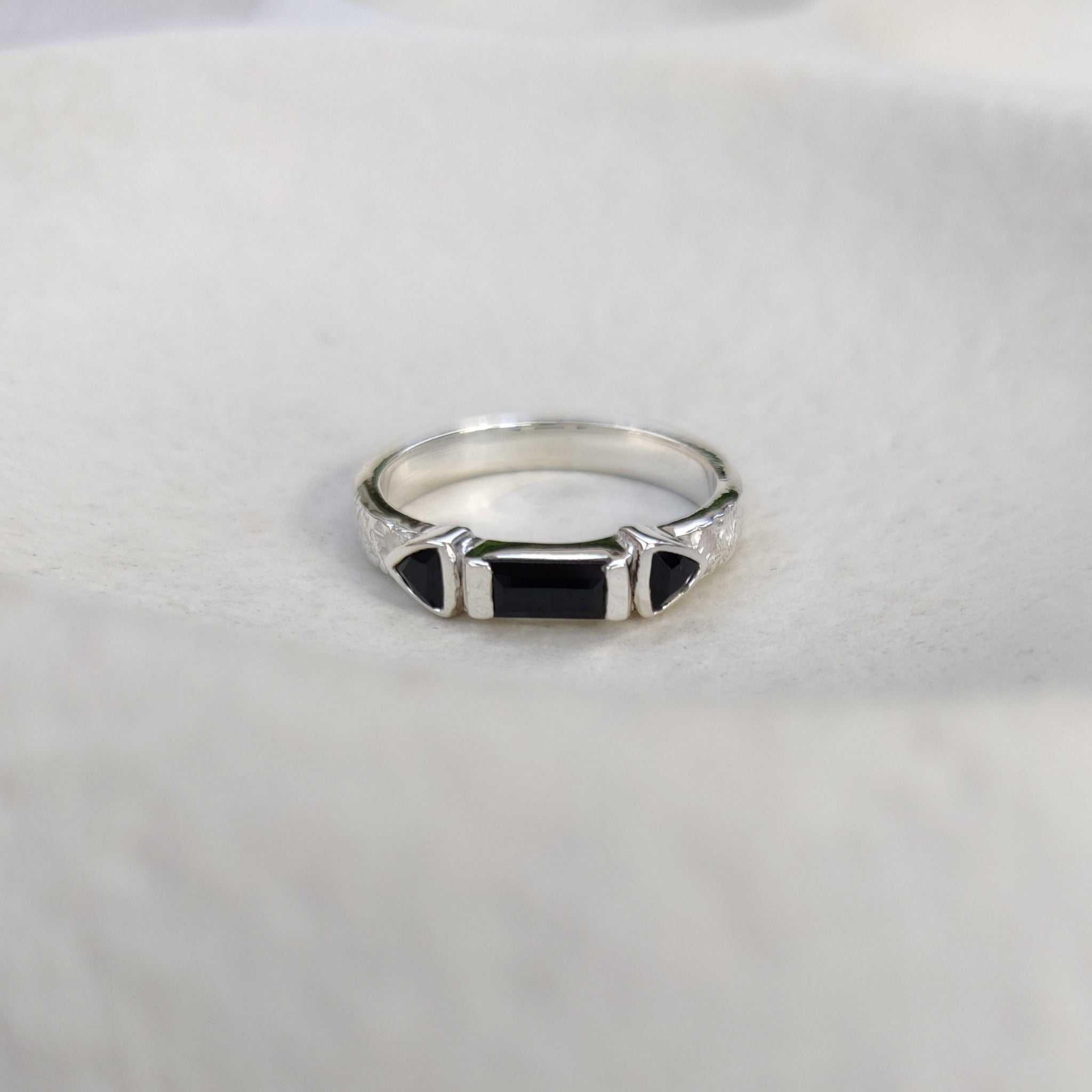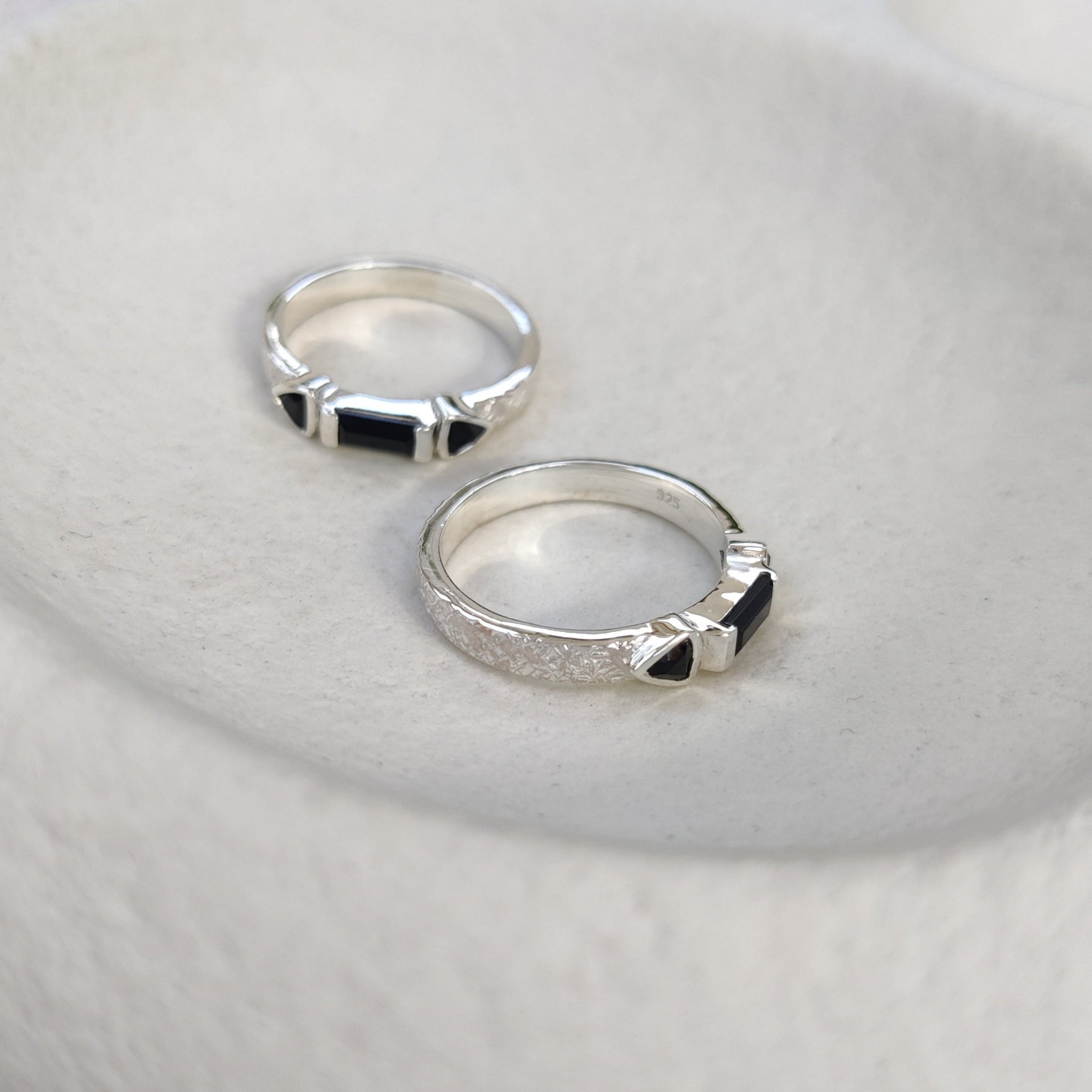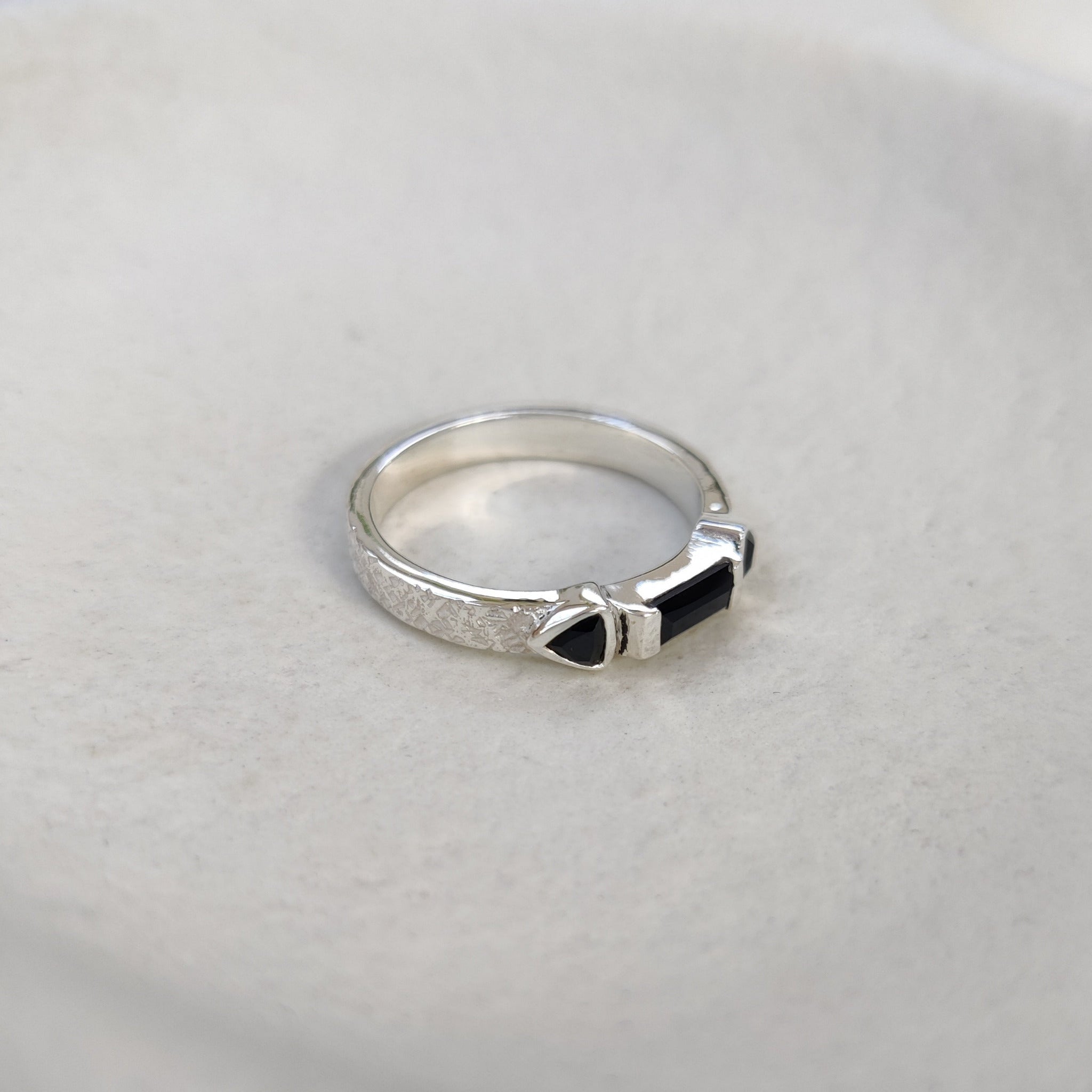 The Relic Ring is featuring mystical black onyx gemstones that sparkle on a textured silver band, evoking mystical ancient jewelry with a modern bohemian twist. Luxurious and eye-catching, perfect for gifting or adding to your own jewelry collection.