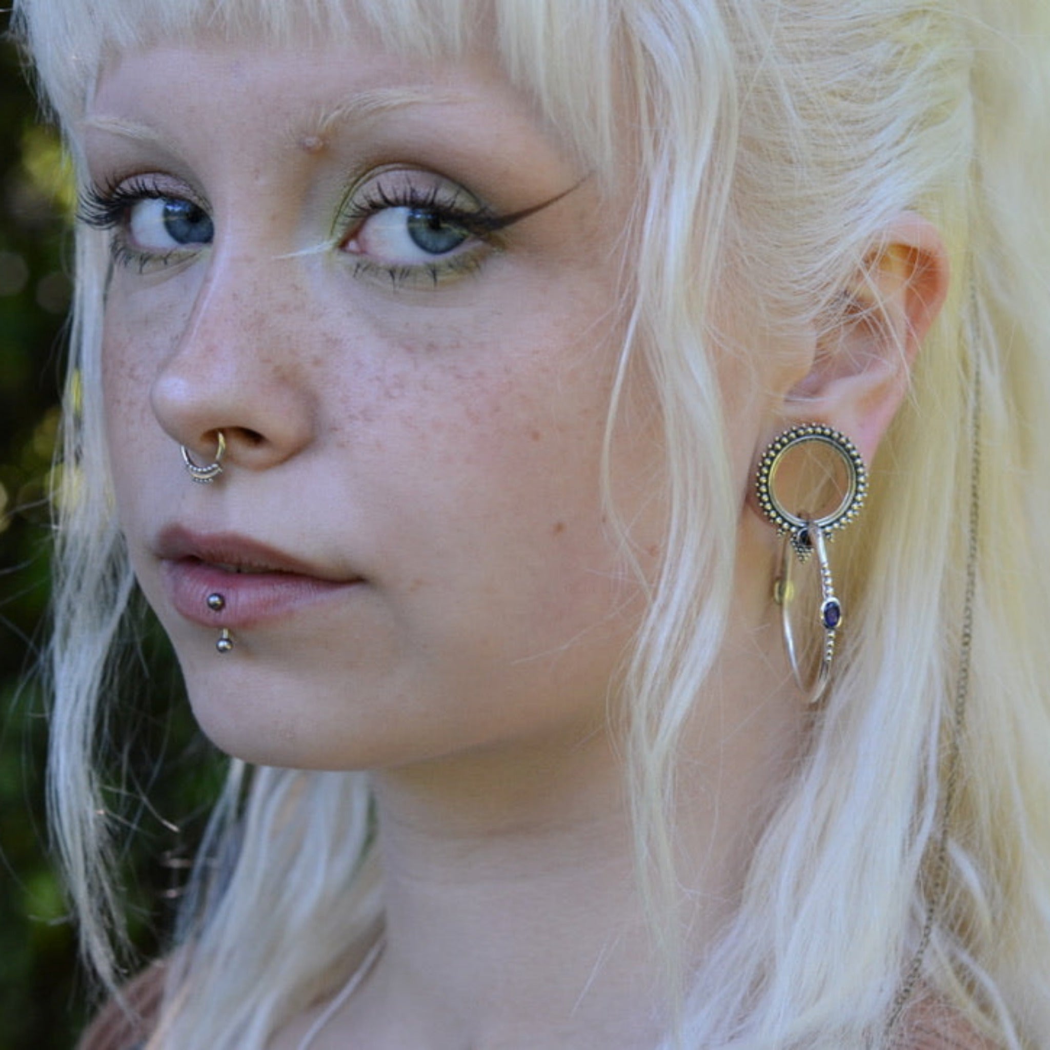 The Pyramid Tunnels features a genuine gemstone nestled within a triangle, adorned with intricate dotted details. Crafted from solid sterling silver and designed for stretched earlobes, these tunnels offer a unique, bohemian look. Pair them with hoop earrings to express your personal style.