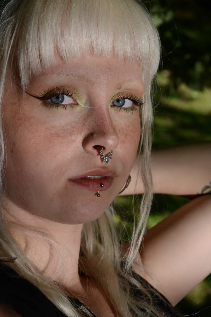 The Pyramid Fake Septum Ring features a sleek V-shaped design, inspired by ancient jewelry. Adorned with intricate dotted details and a captivating tanzanite gemstone centerpiece, it’s crafted from sterling silver for a timeless and luxurious finish. Perfect for daily wear, festivals, or special occasions.