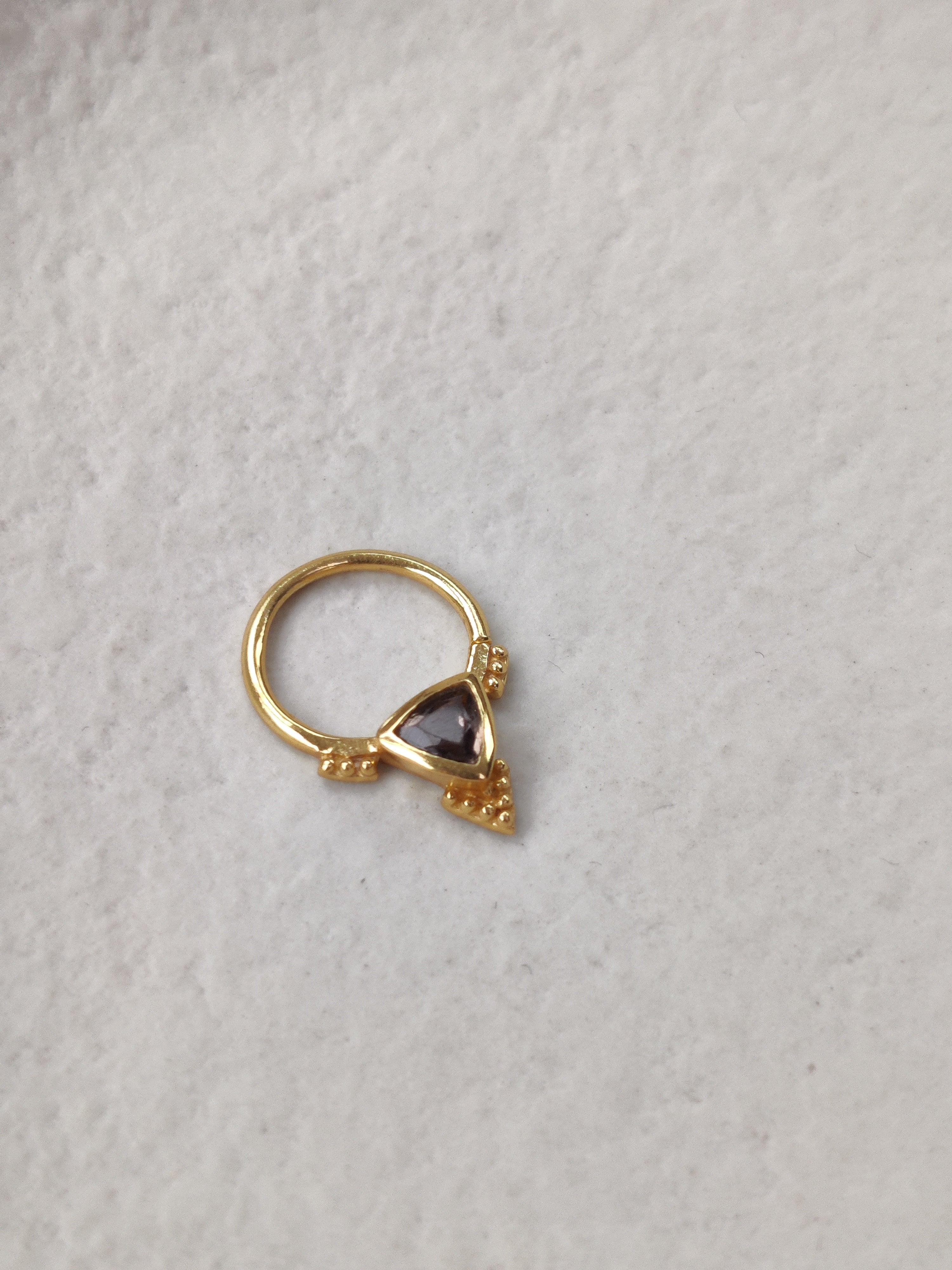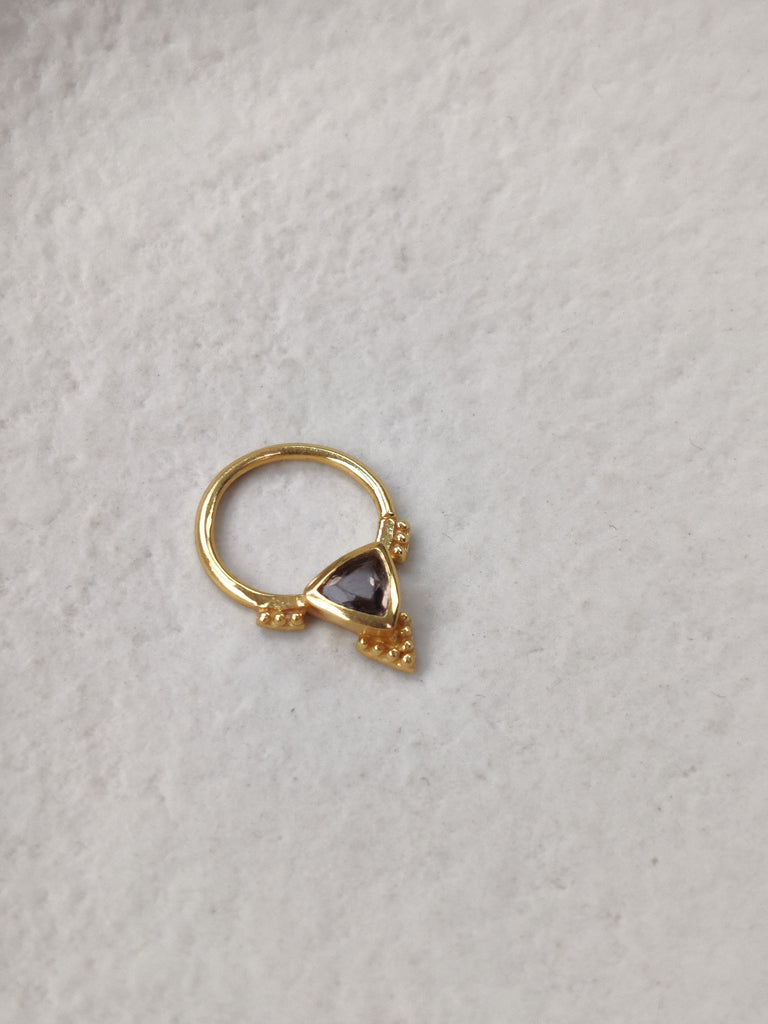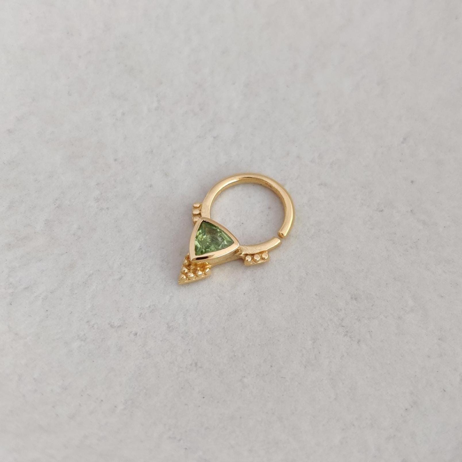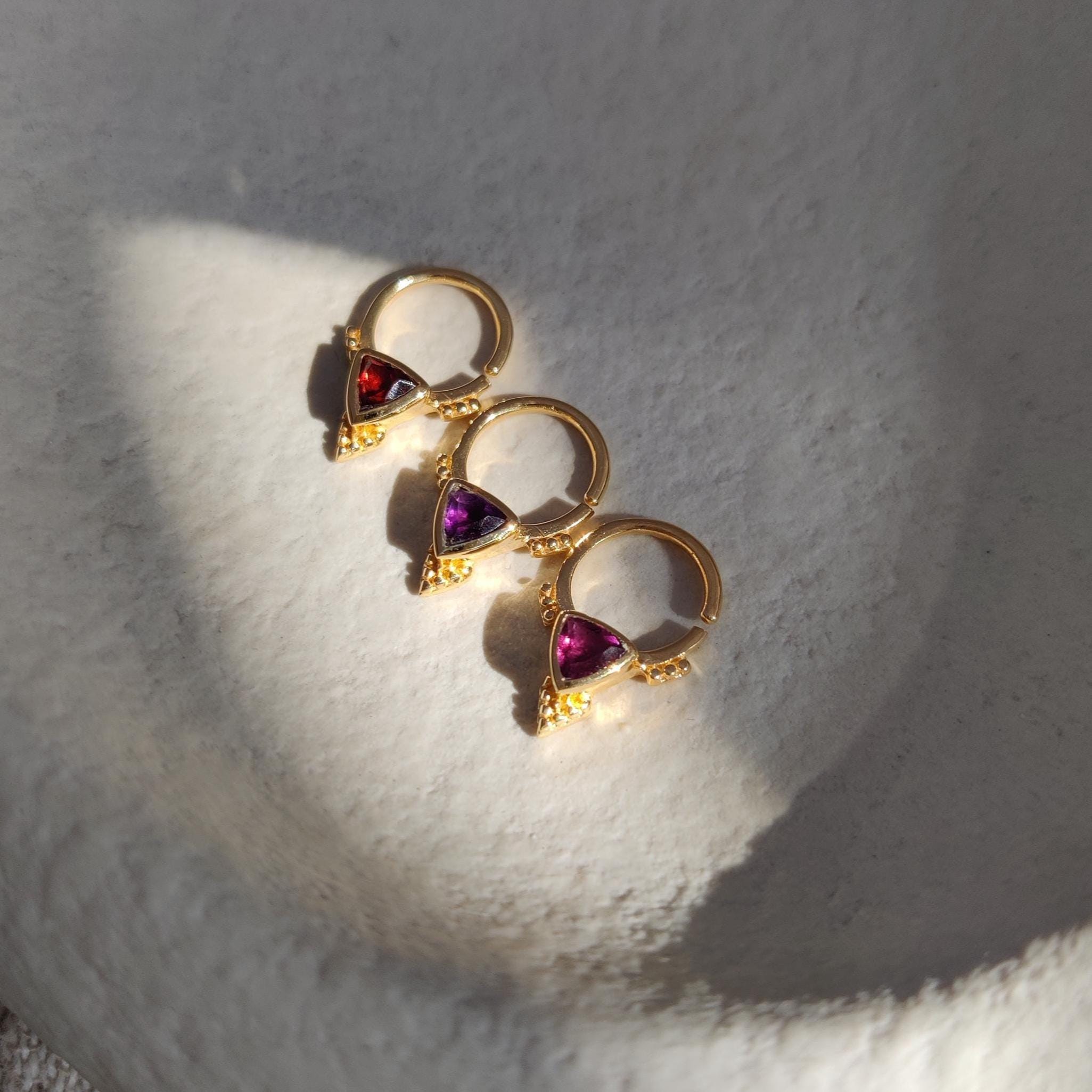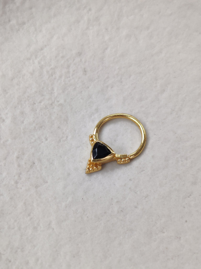 The Ritual Septum is a unique septum nose ring that fuses feminine beauty with tribal style. Featuring a unique triangle-shaped sparkling gemstone, set in 18 karat gold vermeil and tiny dotted detailing will bring a subtle hint of sparkle to your everyday, festival and bridal looks, making you feel beautiful inside and out.