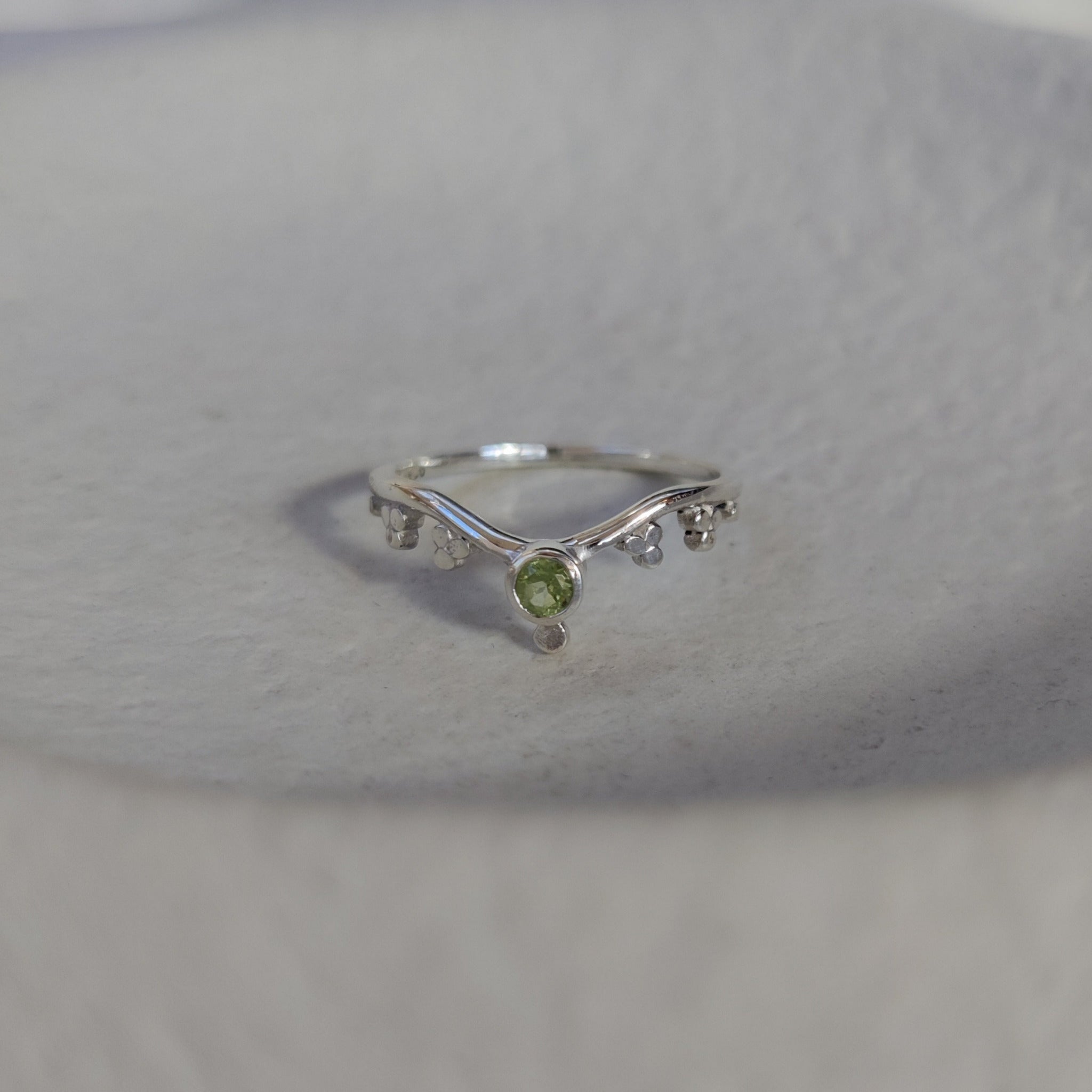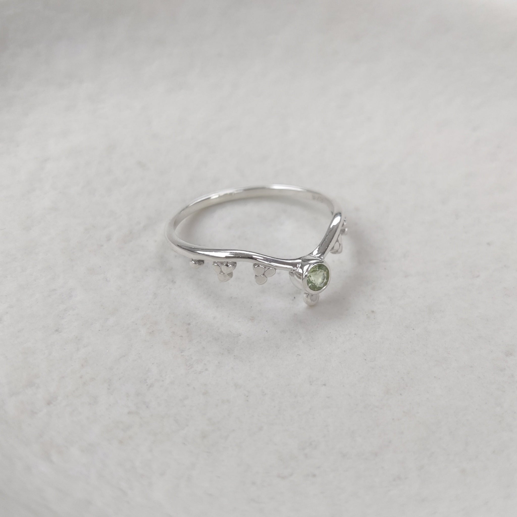 Featuring a tiny gemstone, on a slightly v-shaped band, adorned with delicate dotted details. Perfect for stacking with other gemstone rings or wearing solo, it’s designed for everyday wear and self-expression.