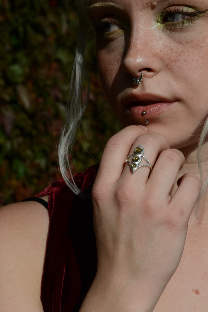The Tides Ring features three radiant peridot gemstones on a textured silver band, symbolizing the ebb and flow of life’s ever-changing journey.