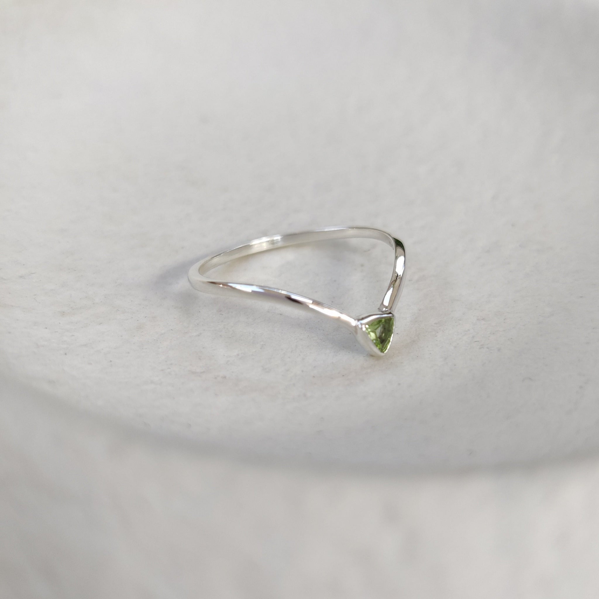 Sleek, minimal, and timeless — the Trillion Ring is a V-shaped gemstone ring in solid silver. Adorned with a tiny sparkling high-grade peridot, that adds a hint of sparkle to any look.