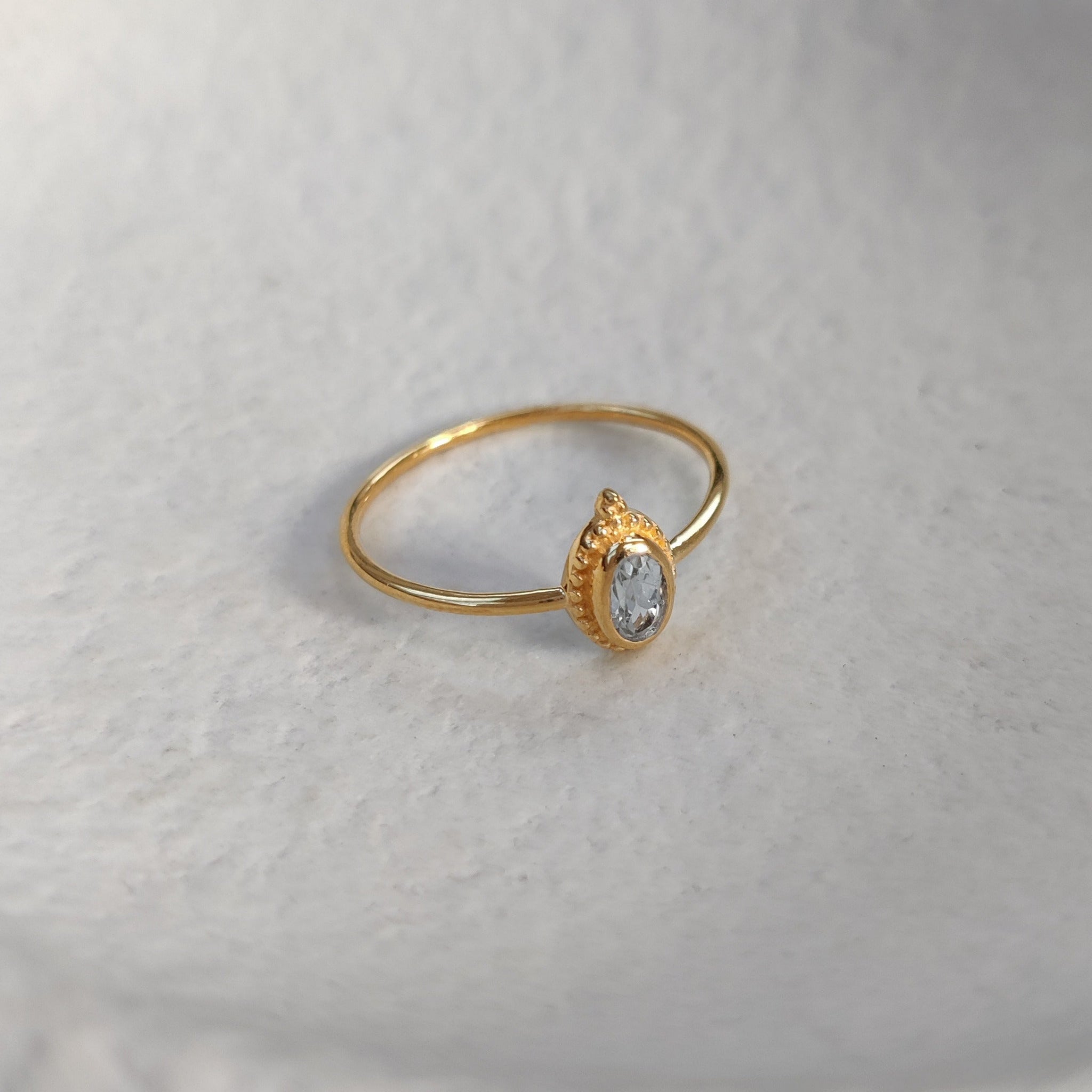 The Classic Ring is a timeless gemstone ring crafted in 2.5 micron 18k gold plating. Adorned with a vibrant faceted blue topaz gemstone for a look that’s both delicate and expressive. A versatile piece for stacking, gifting, or adding everyday sparkle.