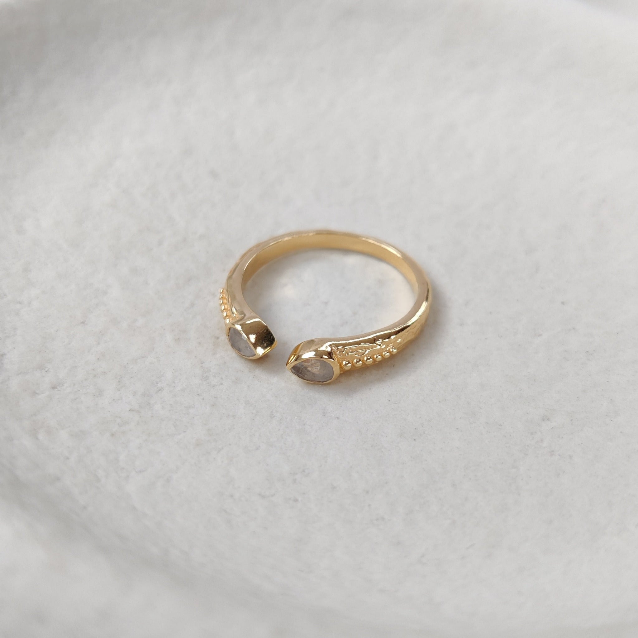 The Artifact Ring is a dainty open cuff ring that evokes the aesthetics of ancient jewelry an adds a touch of sacred beauty to both everyday rituals and meaningful moments. Delicate and radiant, this open cuff ring features two gemstones meeting at the center of a textured band, framed by intricate dotted details.
