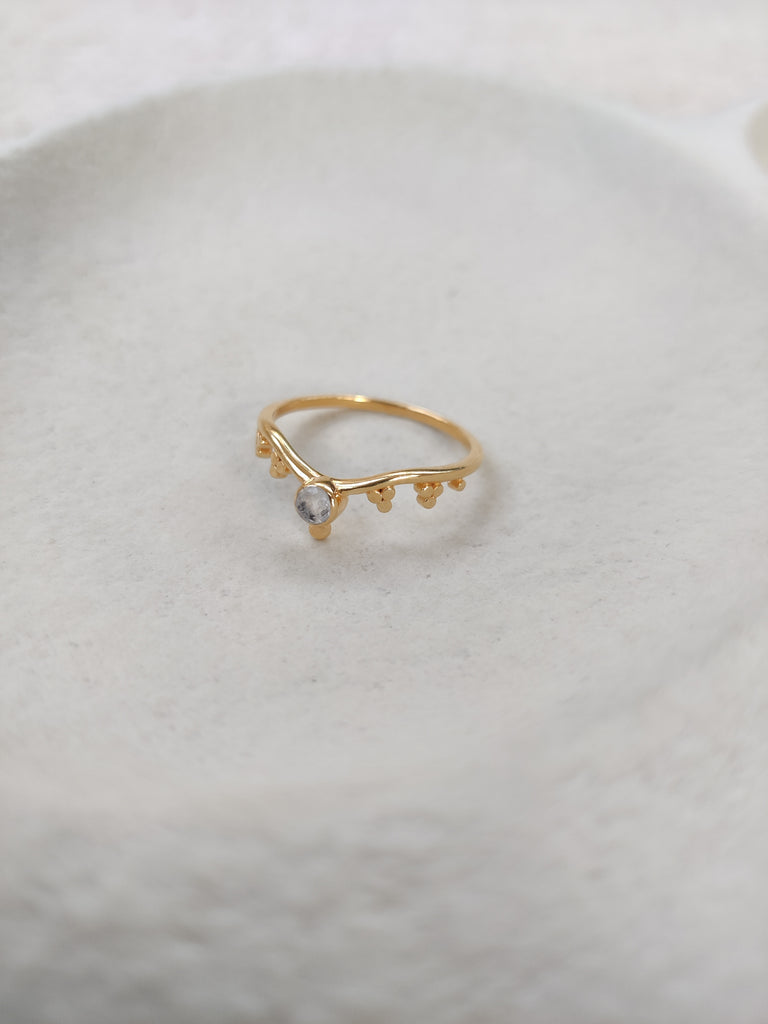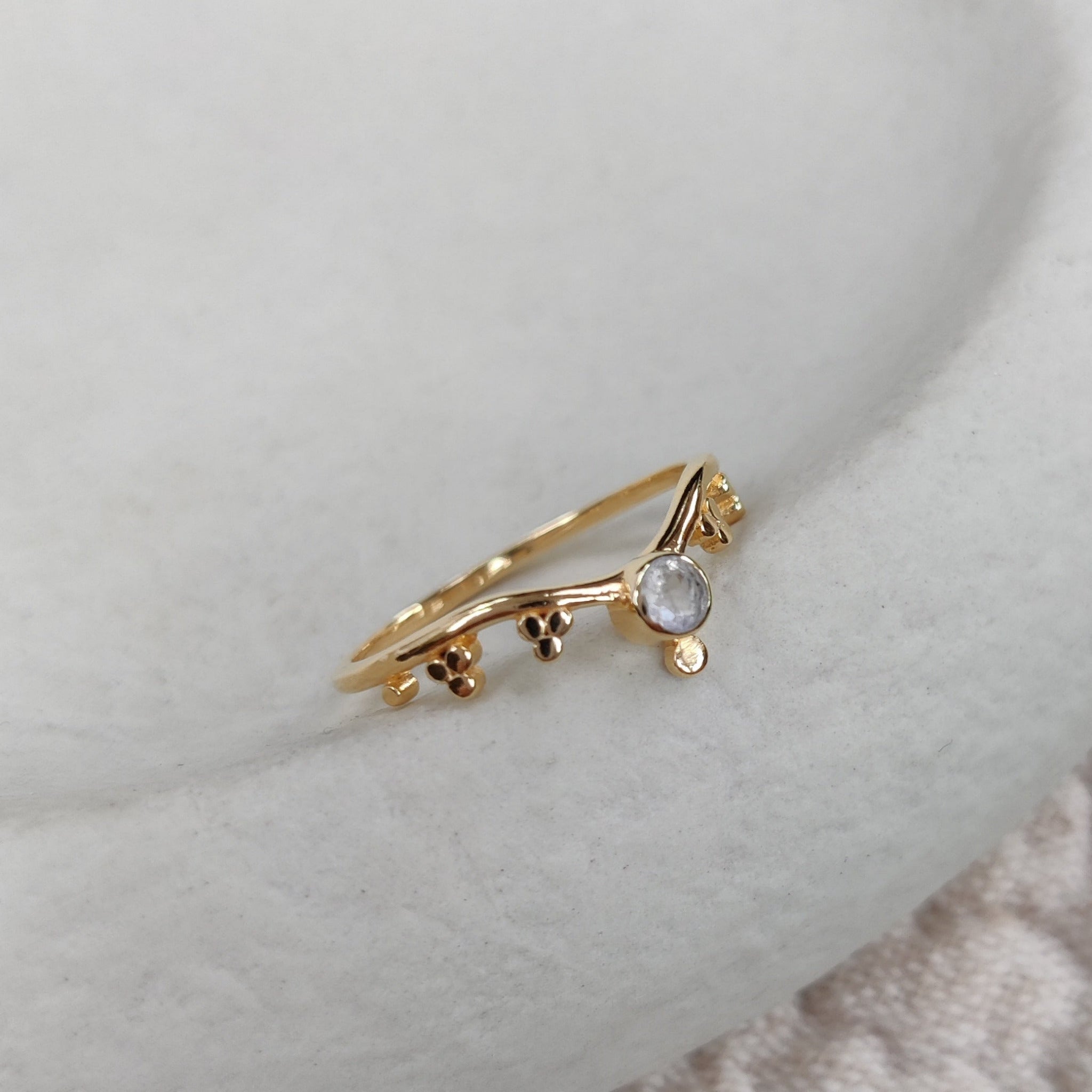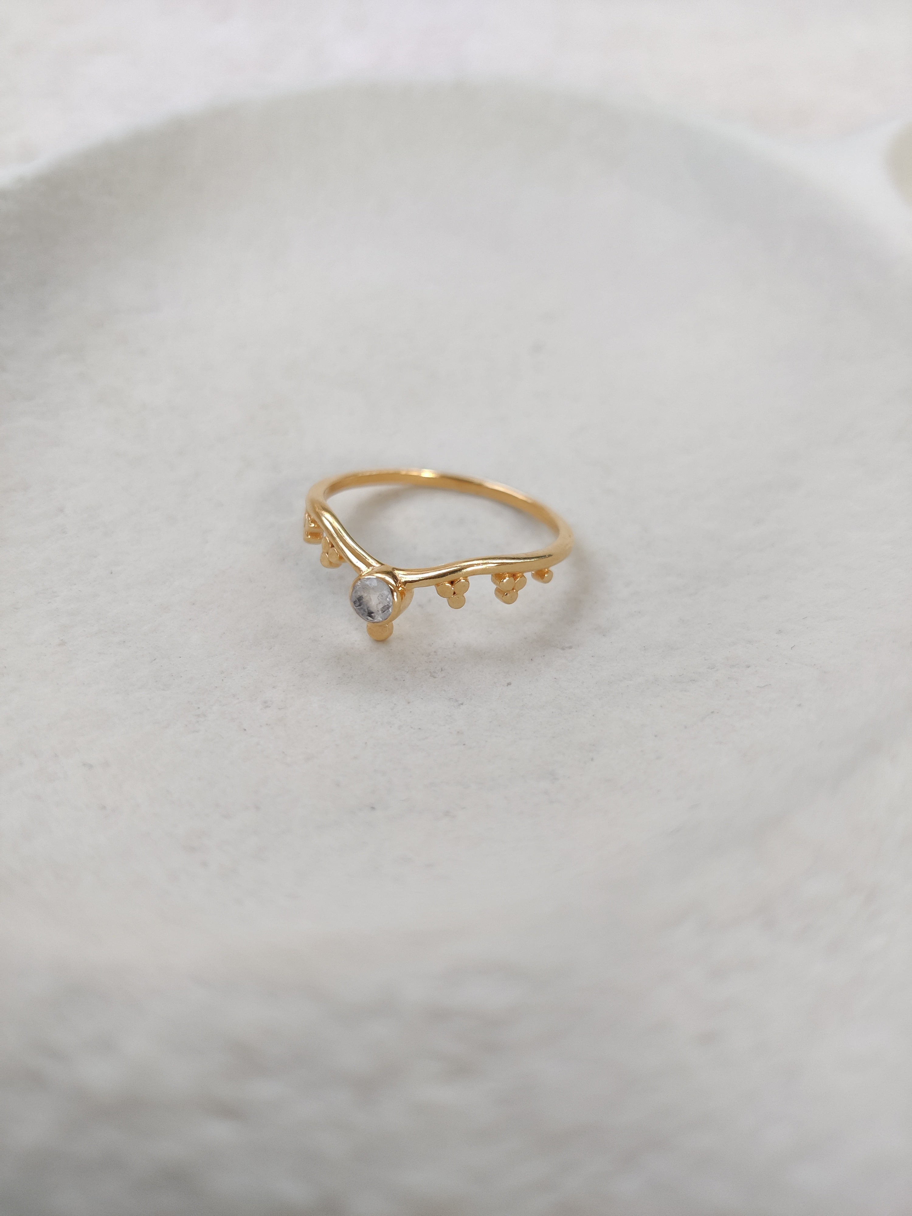 Featuring a tiny gemstone, on a slightly v-shaped band, adorned with delicate dotted details. Perfect for stacking with other gemstone rings or wearing solo, it’s designed for everyday wear and self-expression.