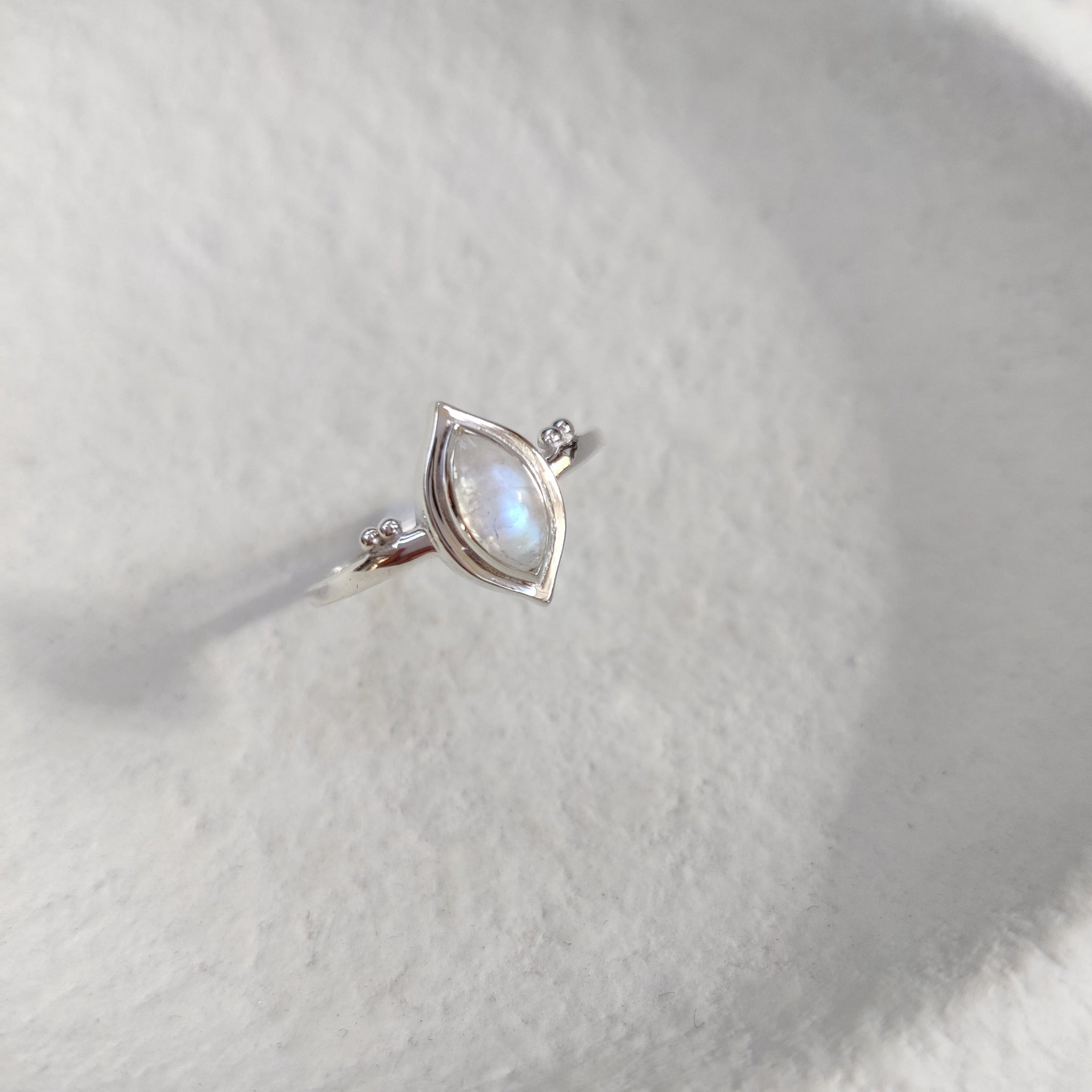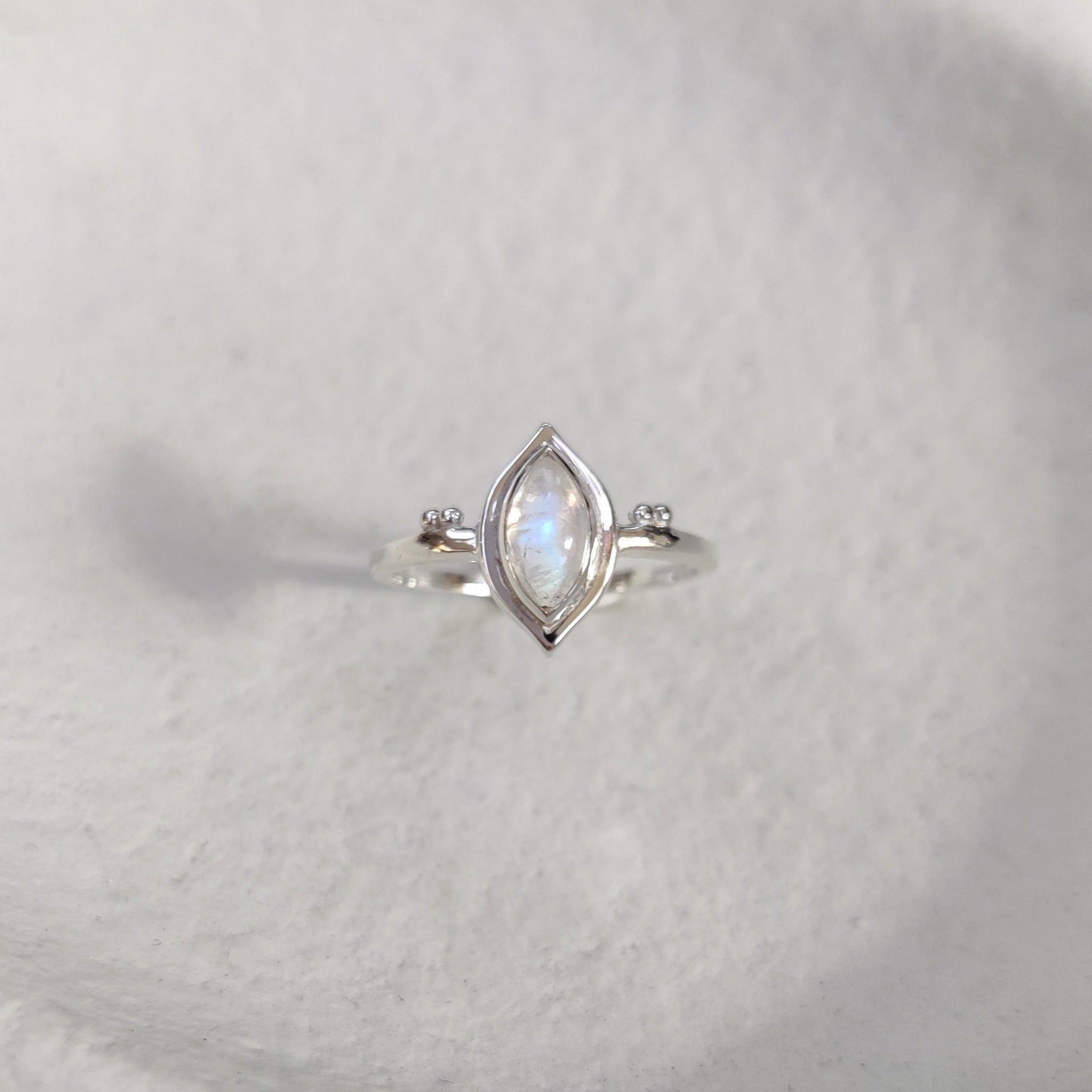 The Siren Ring is inspired by myth and mysticism. Featuring an organic form, with a marquise gemstone centerpiece and dotted details