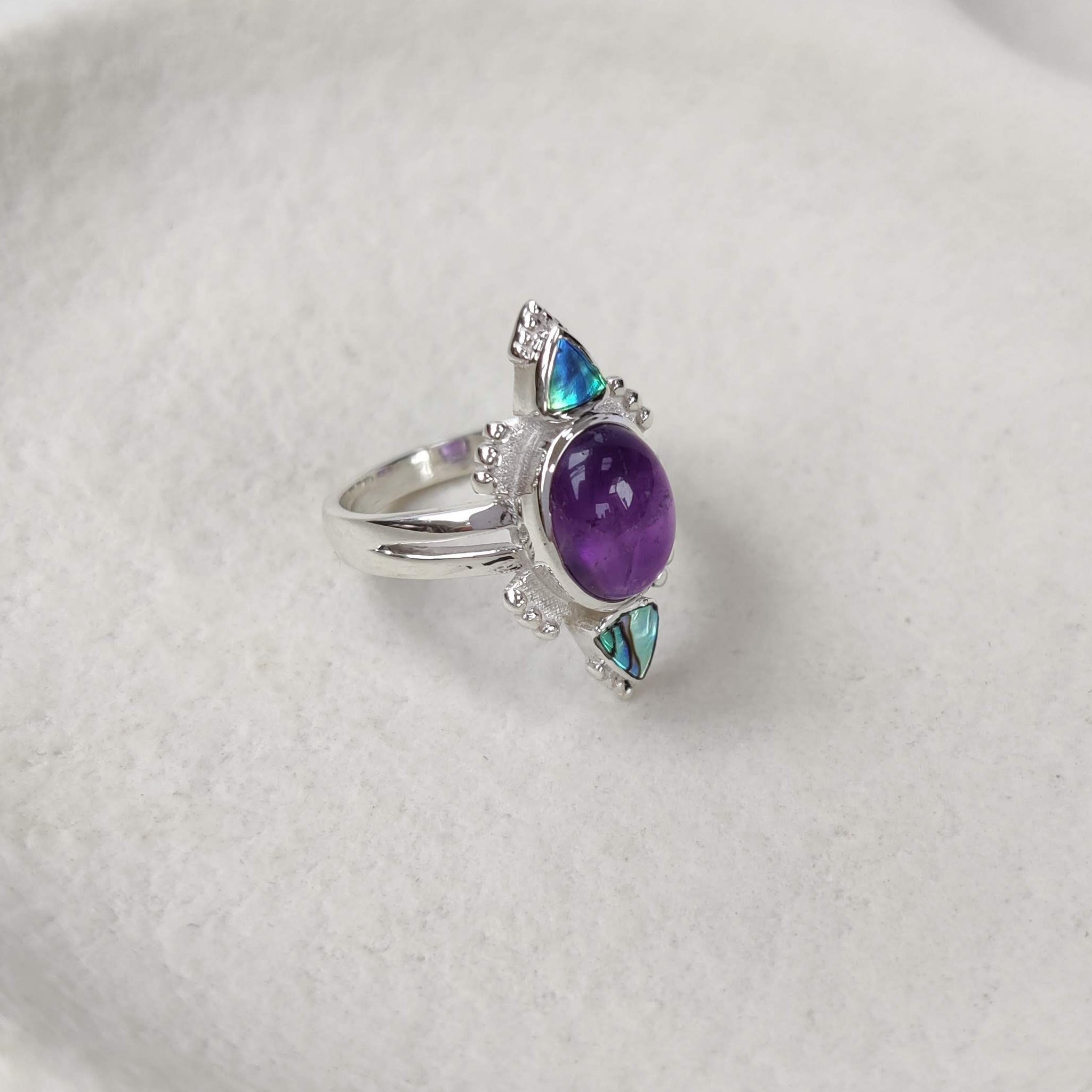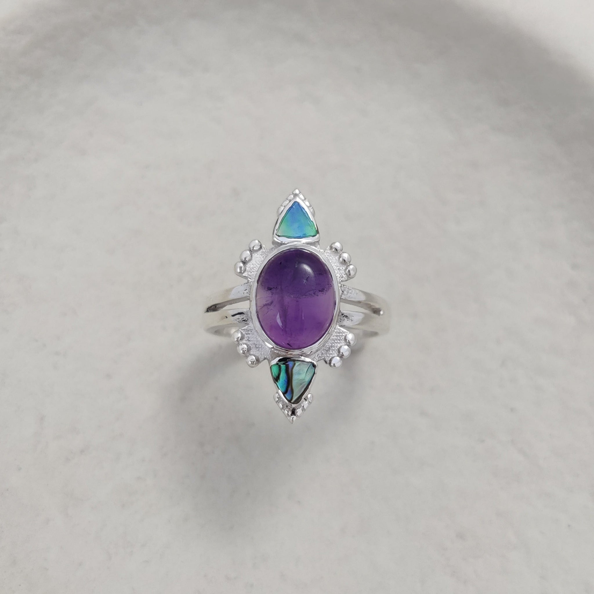 Featuring a deep purple Amethyst framed by shimmering abalone shell, the Ritual Ring evokes celestial beauty and bohemian vibes. Whether worn solo or in a stack, it’s a versatile piece designed for self-expression.