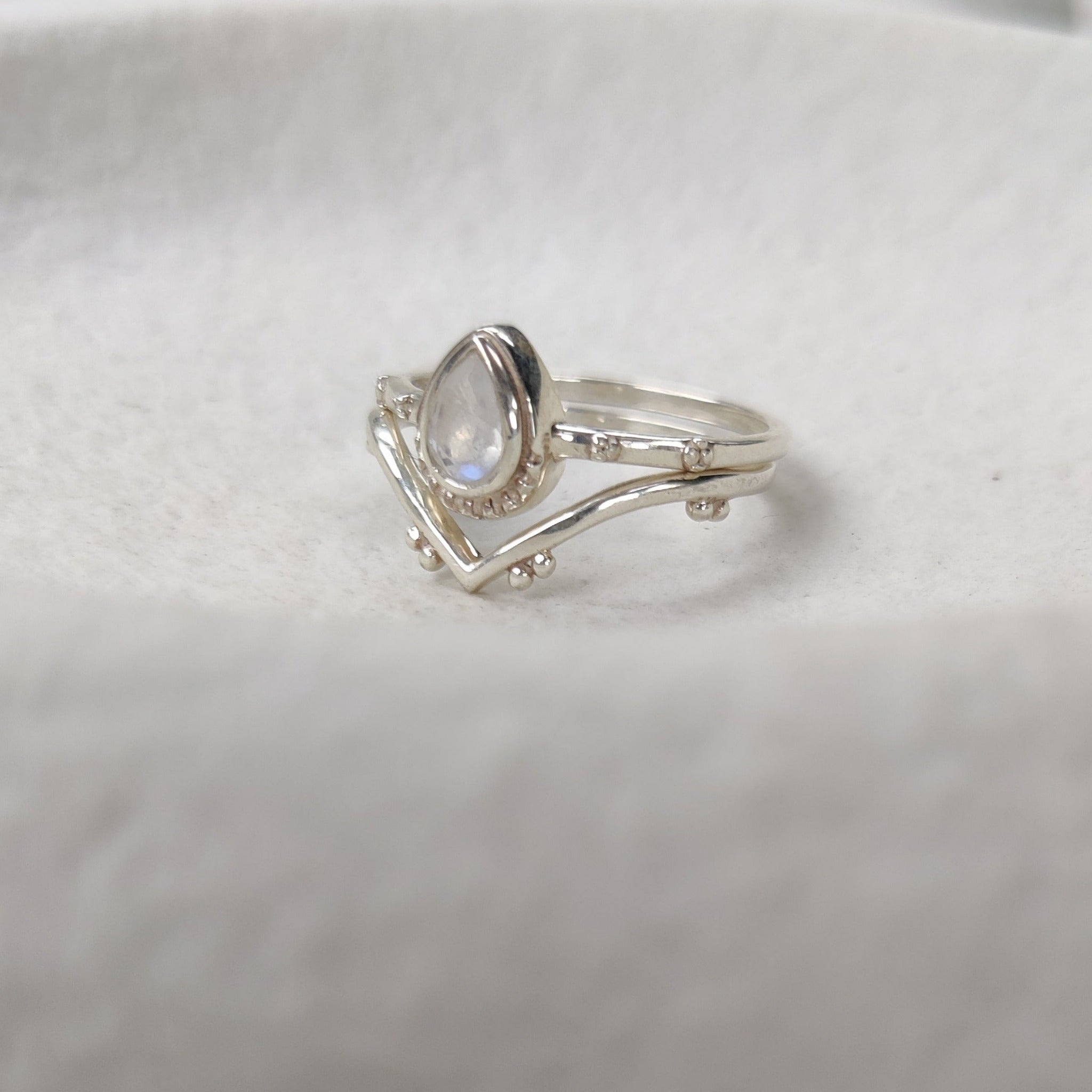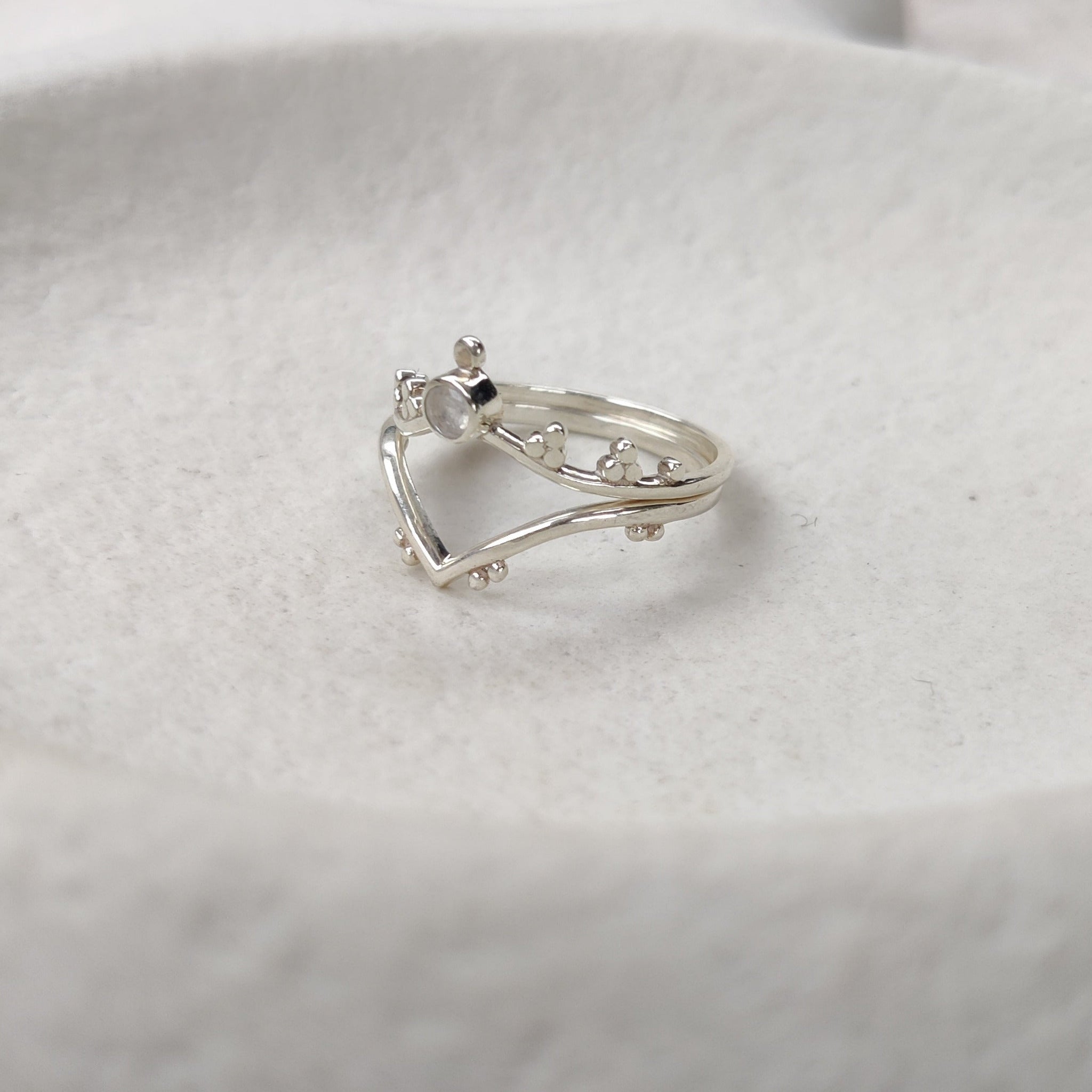 The Chevron Ring is a delicate v-shaped band, designed for a clean and minimalist look with a bohemian touch. Crafted from pure 925 sterling silver, adorned with tiny dotted detailing, adding texture and character while keeping the style effortlessly versatile.