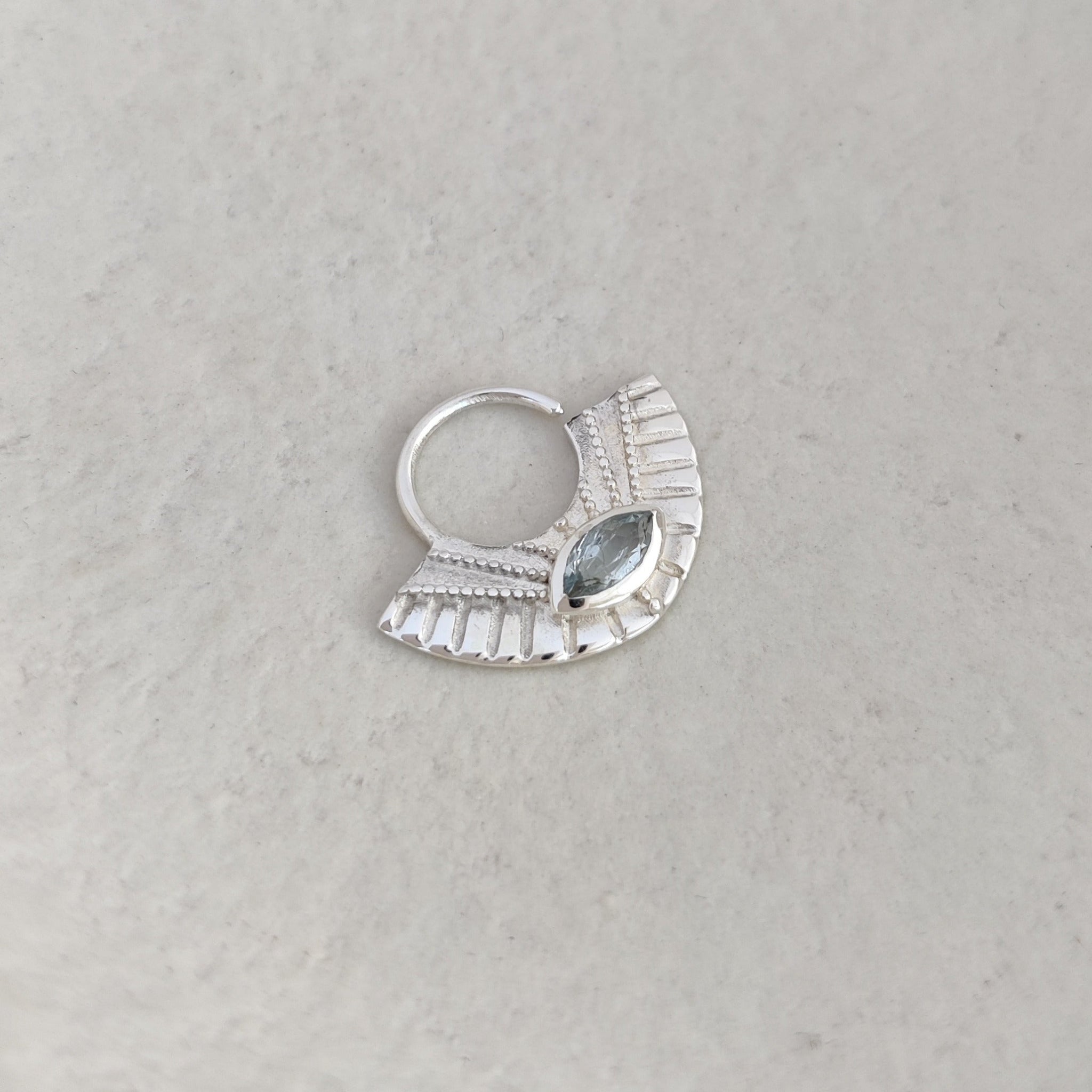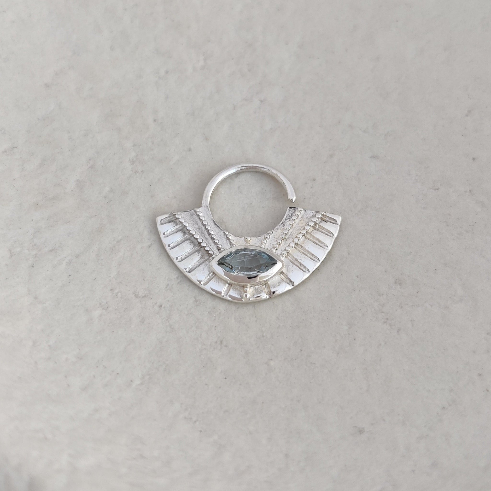 Evoking ancient Egypt’s regal aesthetic, this large septum ring is your perfect finishing touch for festivals, rituals, ceremonies, or everyday wear. This piece is made to turn heads, featuring intricate dotted details, carved lines, and a sparkling marquise-cut gemstone that sparkles with every movement.
