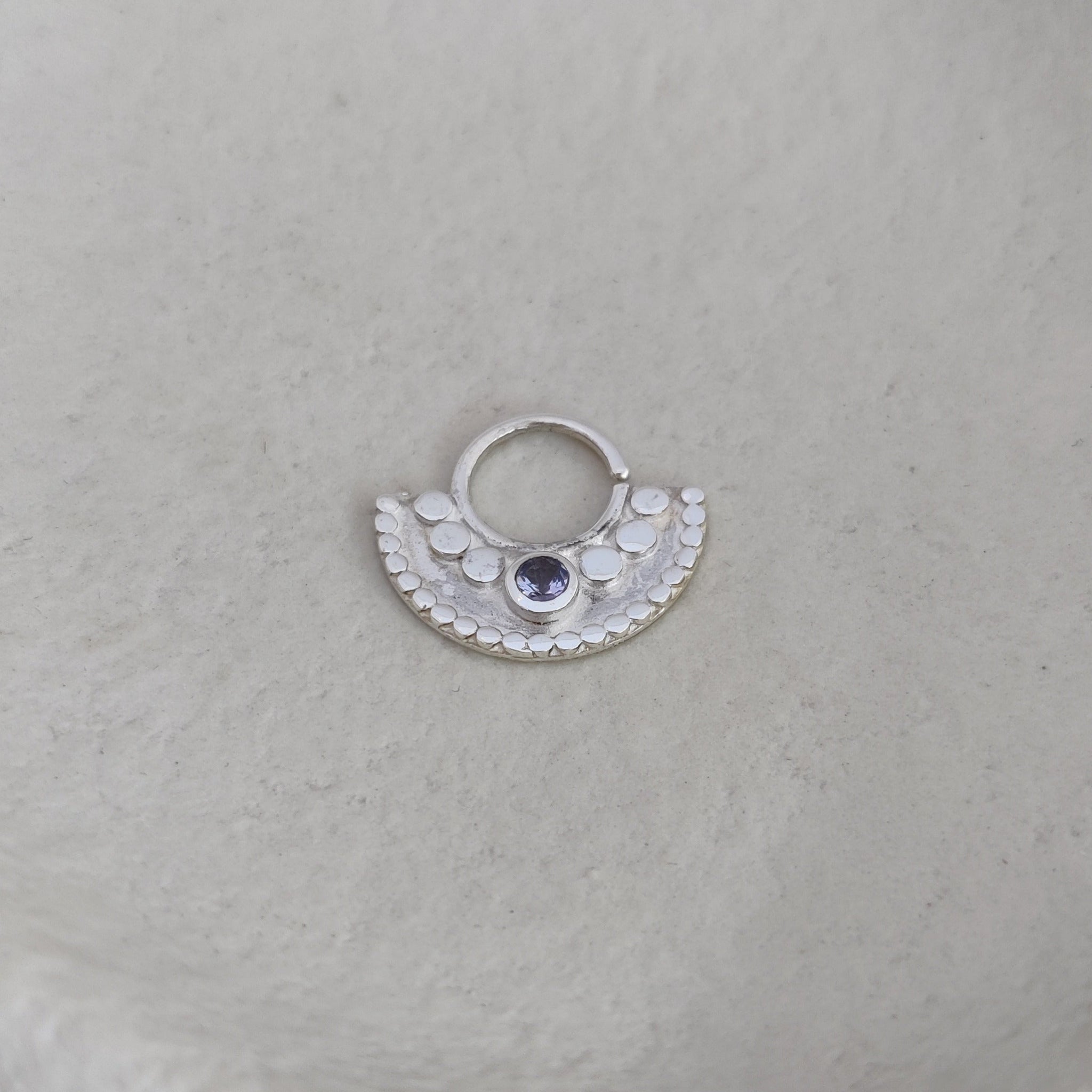 The Sacred Septum is a truly luxurious statement piece for free spirits and wild ones. This beautiful piece features a half-circle design, crafted from solid sterling silver and adorned with a sparkling tanzanite, sprinkled with dotted details.
