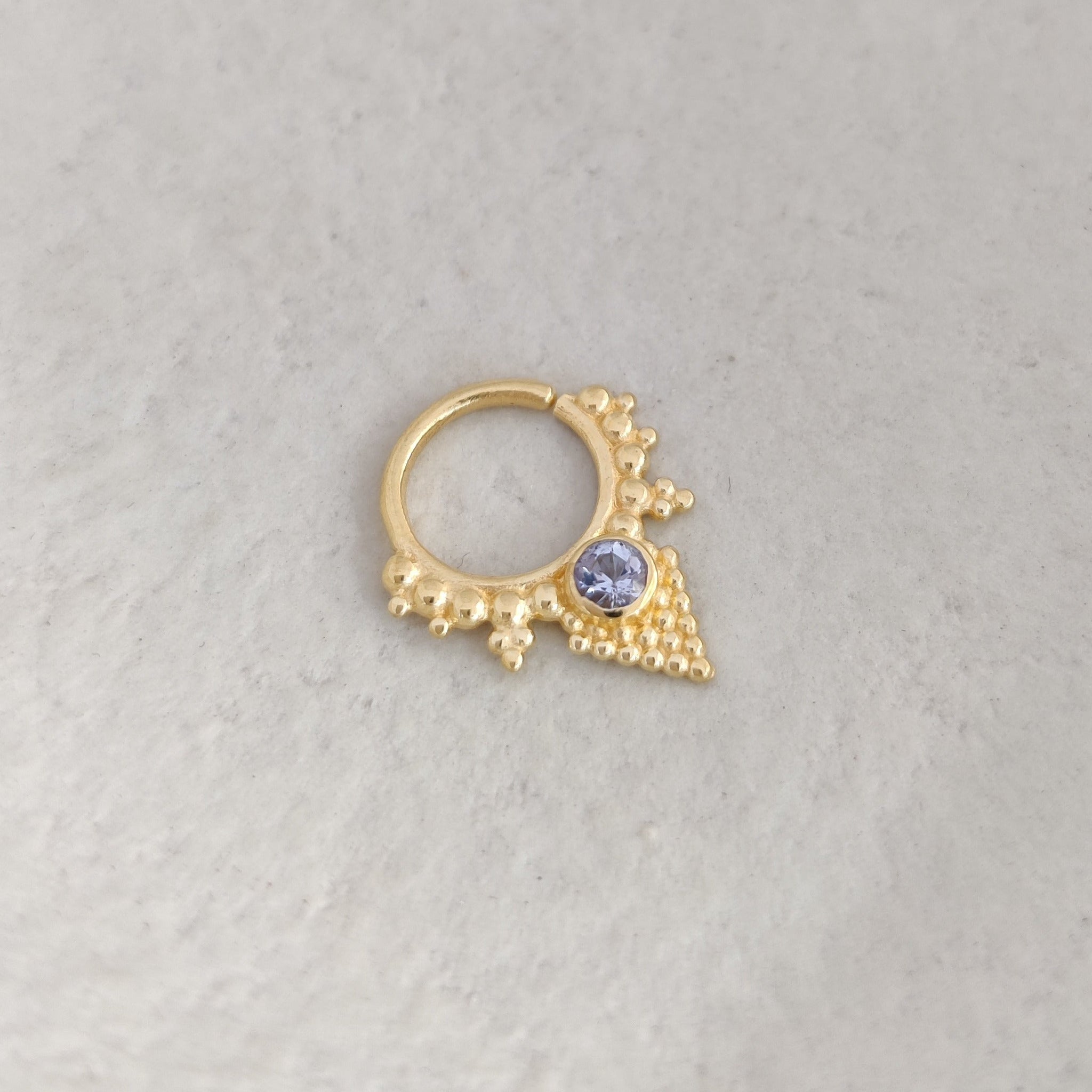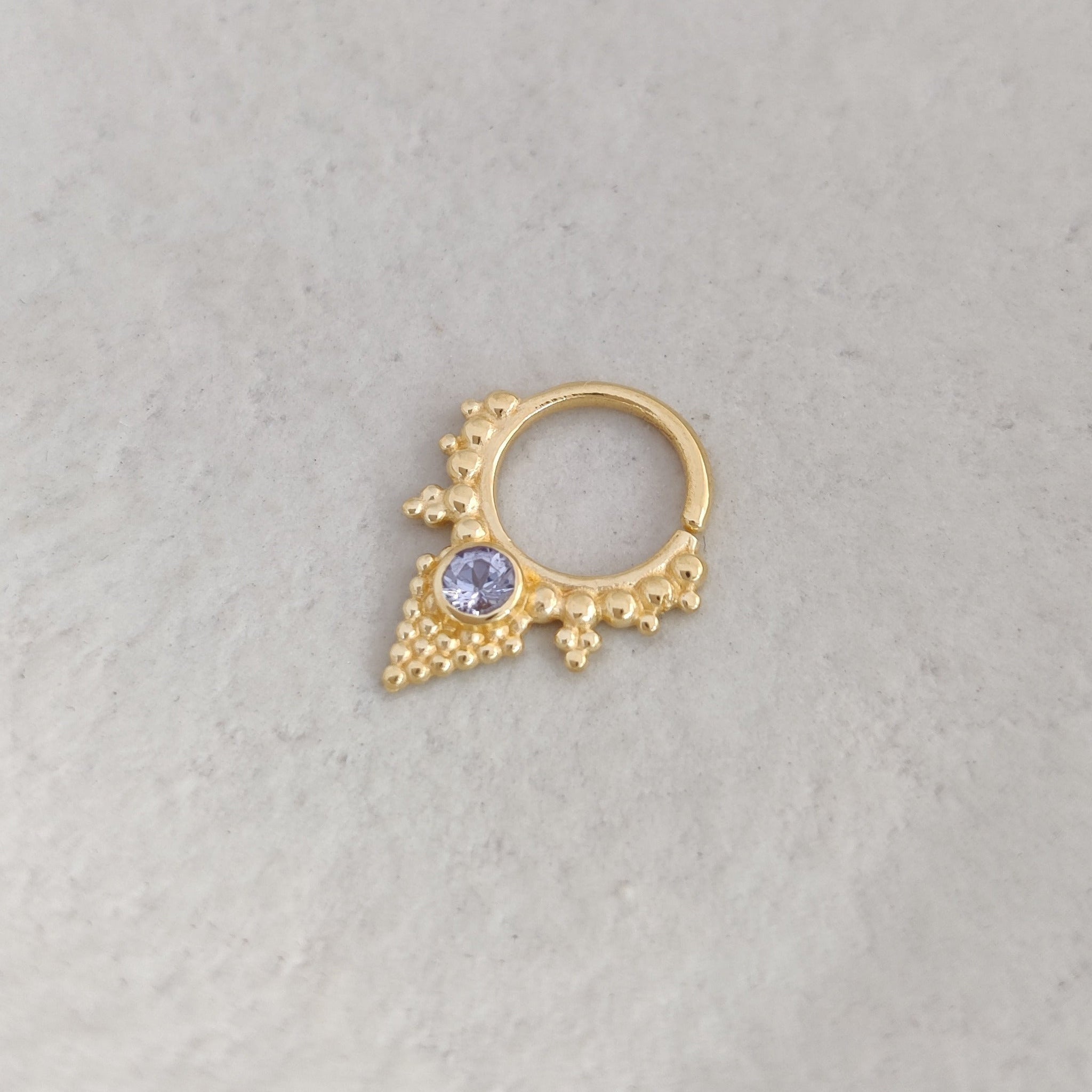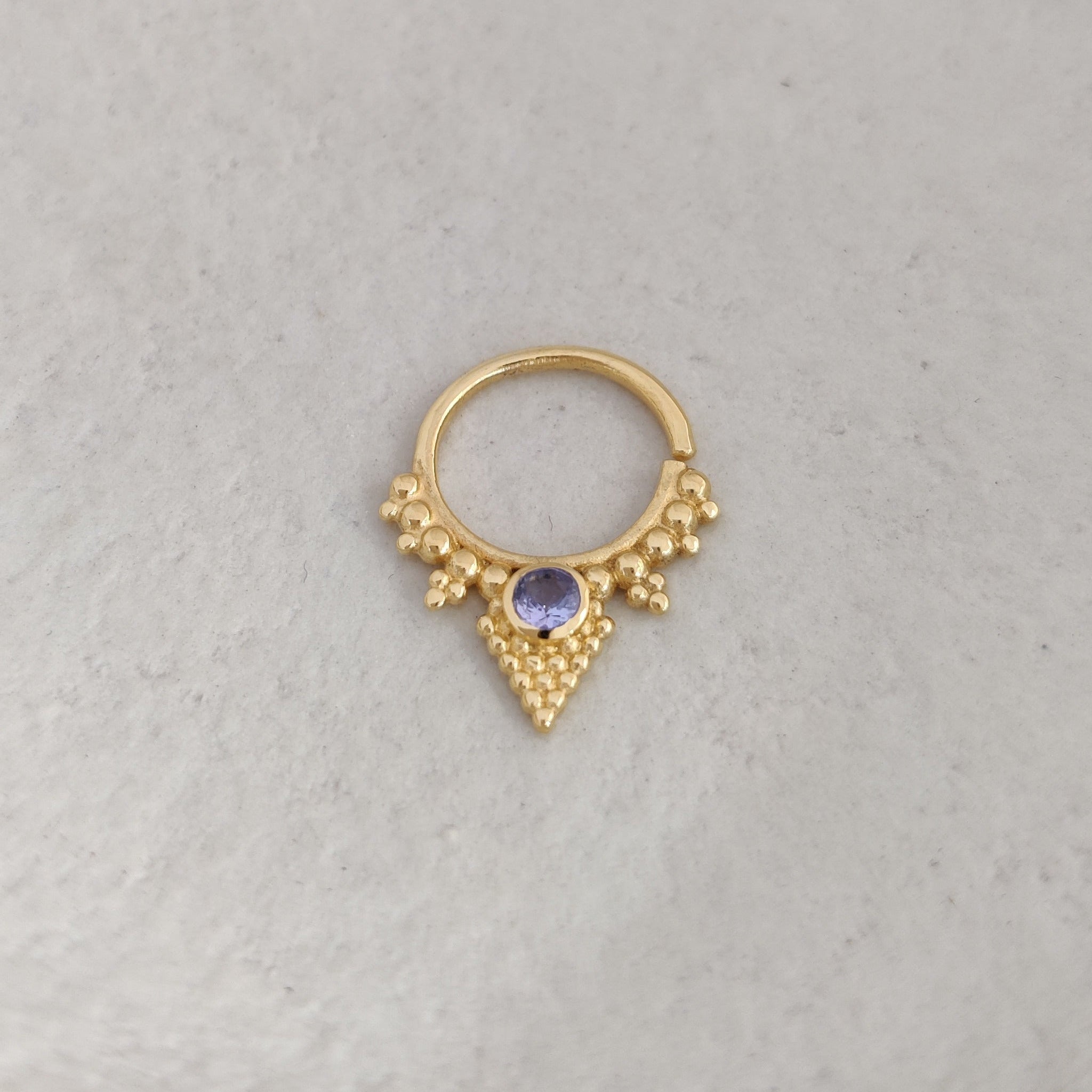 The Pyramid Septum Ring features a sleek V-shaped design, inspired by ancient jewelry. Adorned with intricate dotted details and a captivating tanzanite gemstone centerpiece, it’s crafted from sterling silver for a timeless and luxurious finish.