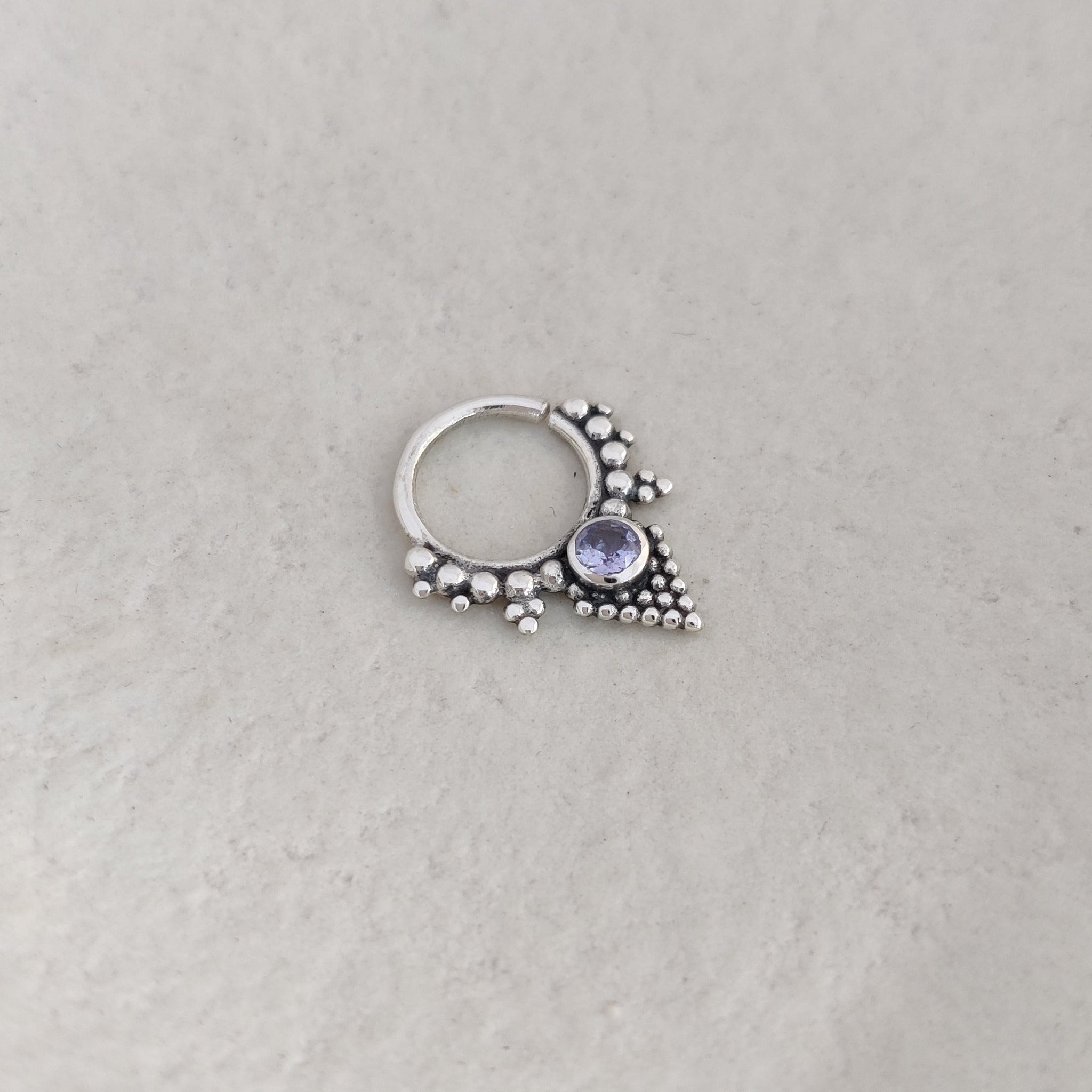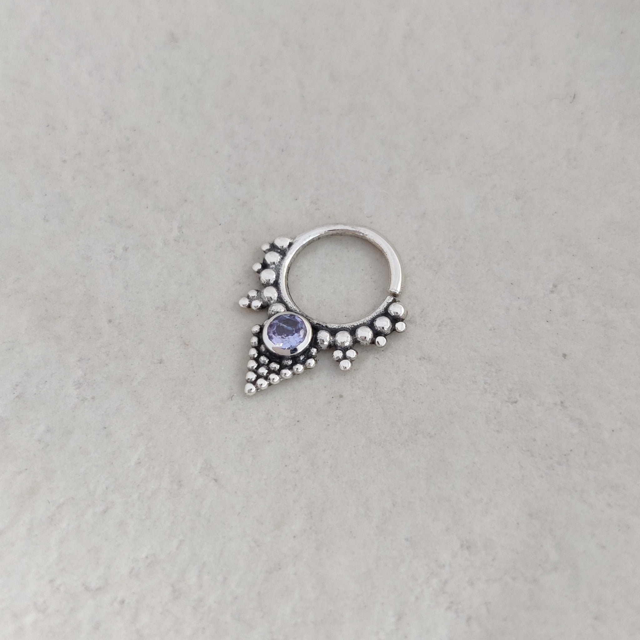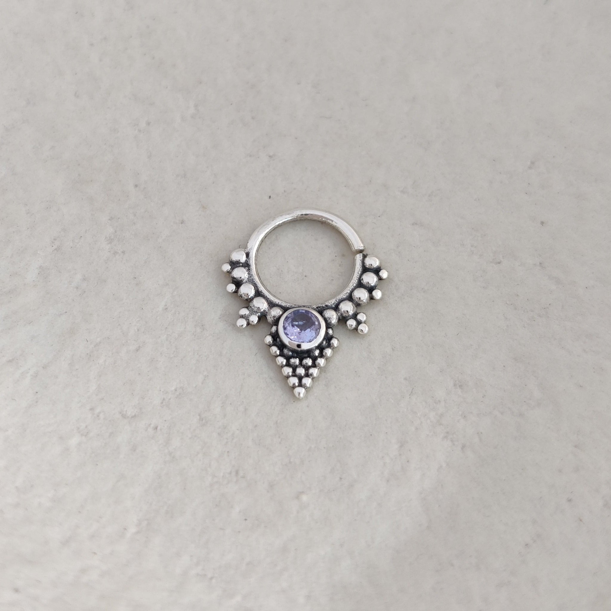The Pyramid Septum Ring features a sleek V-shaped design, inspired by ancient jewelry. Adorned with intricate dotted details and a captivating tanzanite gemstone centerpiece, it’s crafted from sterling silver for a timeless and luxurious finish.